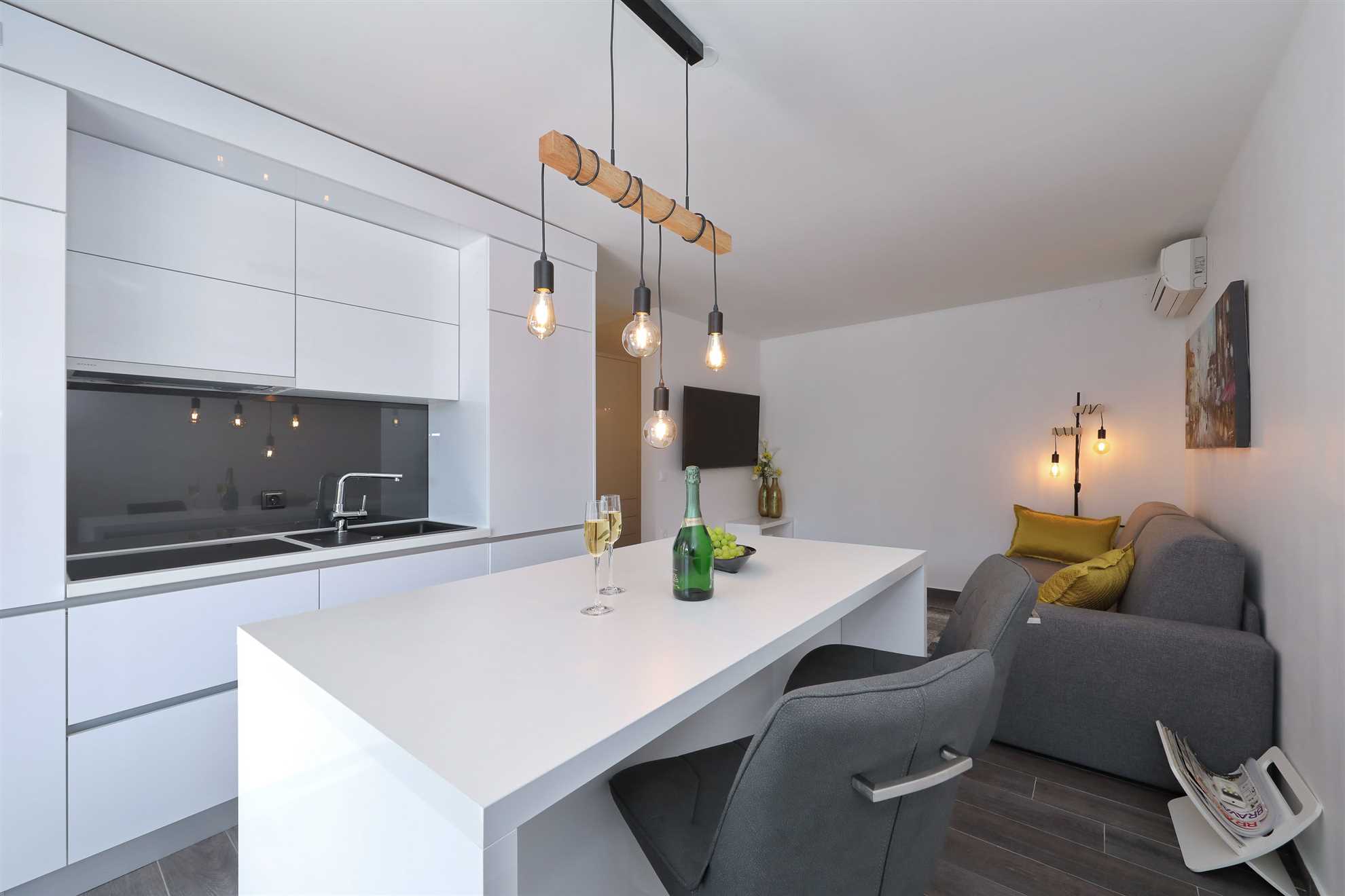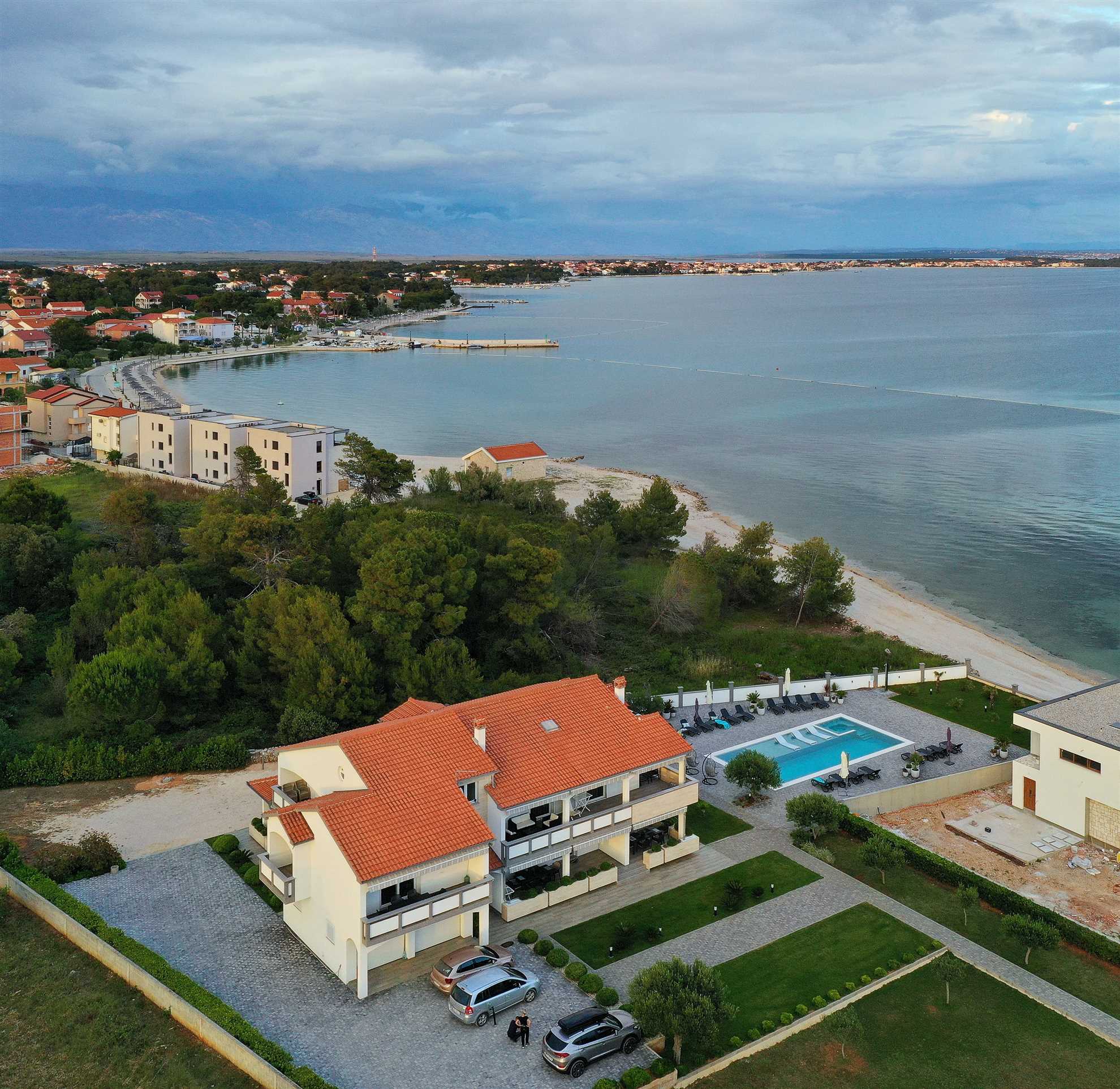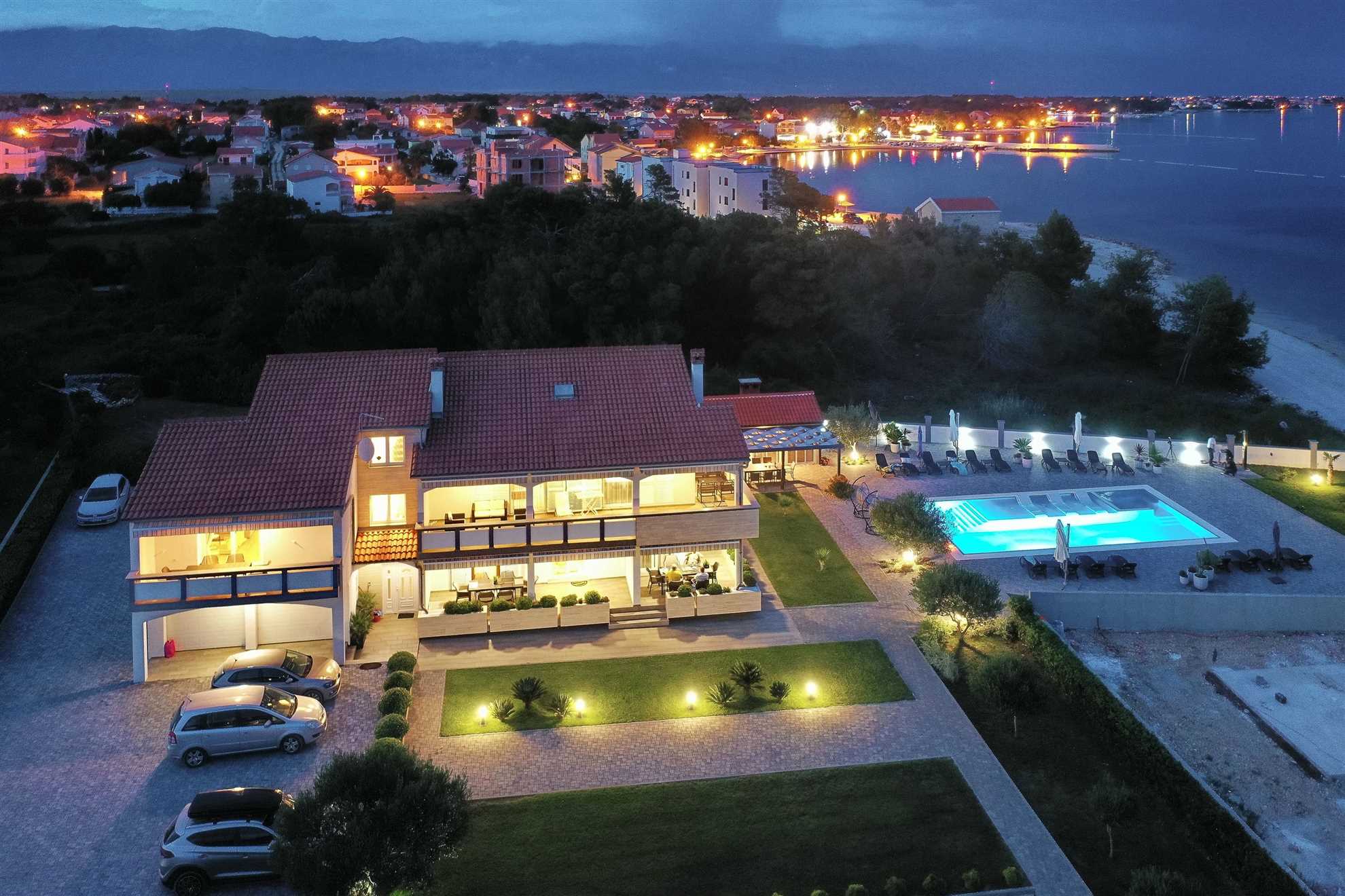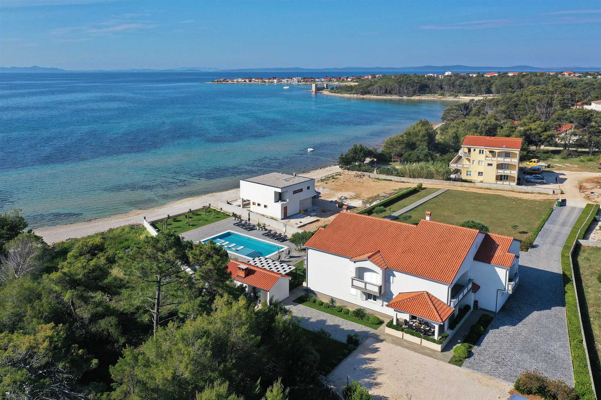 Unser modern eingerichtetes Apartment befindet sich in einer 4-Sterne-Villa direkt am Strand/an der Küste der Insel Vir. Es verfügt über einen 75 m² großen Infinity-Pool mit Whirlpool-Ecke und einen herrlichen Blick auf das Meer, die Bucht und die umliegenden Inseln. Das Apartment ist modern eingerichtet, luftig und hell. Es besteht aus einer Küche, einem Wohnzimmer, einem Schlafzimmer, einem Badezimmer und einer Terrasse. Die Küche ist komplett ausgestattet (Töpfe, Pfannen, Geschirr, Besteck, Mikrowelle, Toaster, Wasserkocher, Kaffeemaschine, Kühlschrank). Gegenüber der Küche befindet sich der Essbereich mit einem Tisch und Stühlen für vier Personen. Küche und Essbereich öffnen sich zum Wohnzimmer mit einem ausziehbaren Schlafsofa, einem Schaukelstuhl, einem Flachbildfernseher mit Satellitenempfang und einer Klimaanlage. Das Schlafzimmer ist mit einem Doppelbett, Nachttischen und einem Einbauschrank ausgestattet. Direkt neben dem Schlafzimmer befindet sich das Badezimmer mit Dusche. Die Terrasse ist durch die Küche zugänglich und mit einem Tisch und Stühlen möbliert. Den Gästen steht die Umgebung des Hauses zur Verfügung, darunter der Garten/Grillhaus (mit Küchenzeile), der Infinity-Pool mit Whirlpool-Ecke und Liegestühlen, ein Parkplatz und eine Garage. In der Garage können die Gäste unter anderem Motorräder, Fahrräder und aufblasbare Wassersportgeräte (Matratzen, Boote usw.) unterstellen. Die Gäste haben ihre Privatsphäre, aber einer von uns steht ihnen jederzeit zur Verfügung, falls sie etwas benötigen. In der Nähe befinden sich zahlreiche Parks und Orte mit unberührter Natur. Nationalparks mit reicher Flora und Fauna sowie Flüsse mit kristallklarem Wasser, wie zum Beispiel der Fluss Zrmanja, der sich ideal zum Rafting eignet, liegen etwa 15 km vom Haus entfernt. Das spektakuläre Velebit-Gebirge, geschützt durch den Nationalpark „Paklenica“ (ca. 60 km), bietet wunderschöne Wander-, Jogging- und Radwege (über 200 km lang) sowie zahlreiche Möglichkeiten zum Klettern und Bungee-Jumping. Dieses relativ kleine Gebiet weist eine Fülle geomorphologischer Phänomene und Formen auf, wie zum Beispiel „Manita peć“ und „Cerovačke pećine“. Sie können auch „in die Fußstapfen“ des Films „Winnetou“ treten, der in Paklenica gedreht wurde. Auf der anderen Seite sind die 89 Karstinseln, Inselchen und Riffe des Nationalparks Kornati, oft als „nautisches Paradies“ bezeichnet, mit einer eintägigen Bootsfahrt von Zadar aus zu erreichen. Die nächste Bushaltestelle befindet sich 1 km entfernt, neben der Inselkirche oder auf dem Platz neben dem Restaurant „Viranka“. Die Buslinie verbindet die Insel mit der nächstgrößeren Stadt, Zadar. Die Linie verkehrt etwa stündlich. Die Insel verfügt auch über einen eigenen Taxiservice. Es gibt auch organisierte Bootsausflüge vom Inselzentrum aus (Buchung im Touristeninformationsbüro). Das Haus liegt in einer ruhigen Gegend am Rande des Stadtzentrums. Das Zentrum ist zu Fuß erreichbar (ca. 5 Minuten) und alles ist ganz in der Nähe, jedoch ohne den üblichen Trubel einer geschäftigen Innenstadt. Der nächste Lebensmittelladen ist ca. 1 km entfernt. Das nächste Restaurant befindet sich im Umkreis von 800 Metern. Der Strand liegt direkt vor dem Haus.