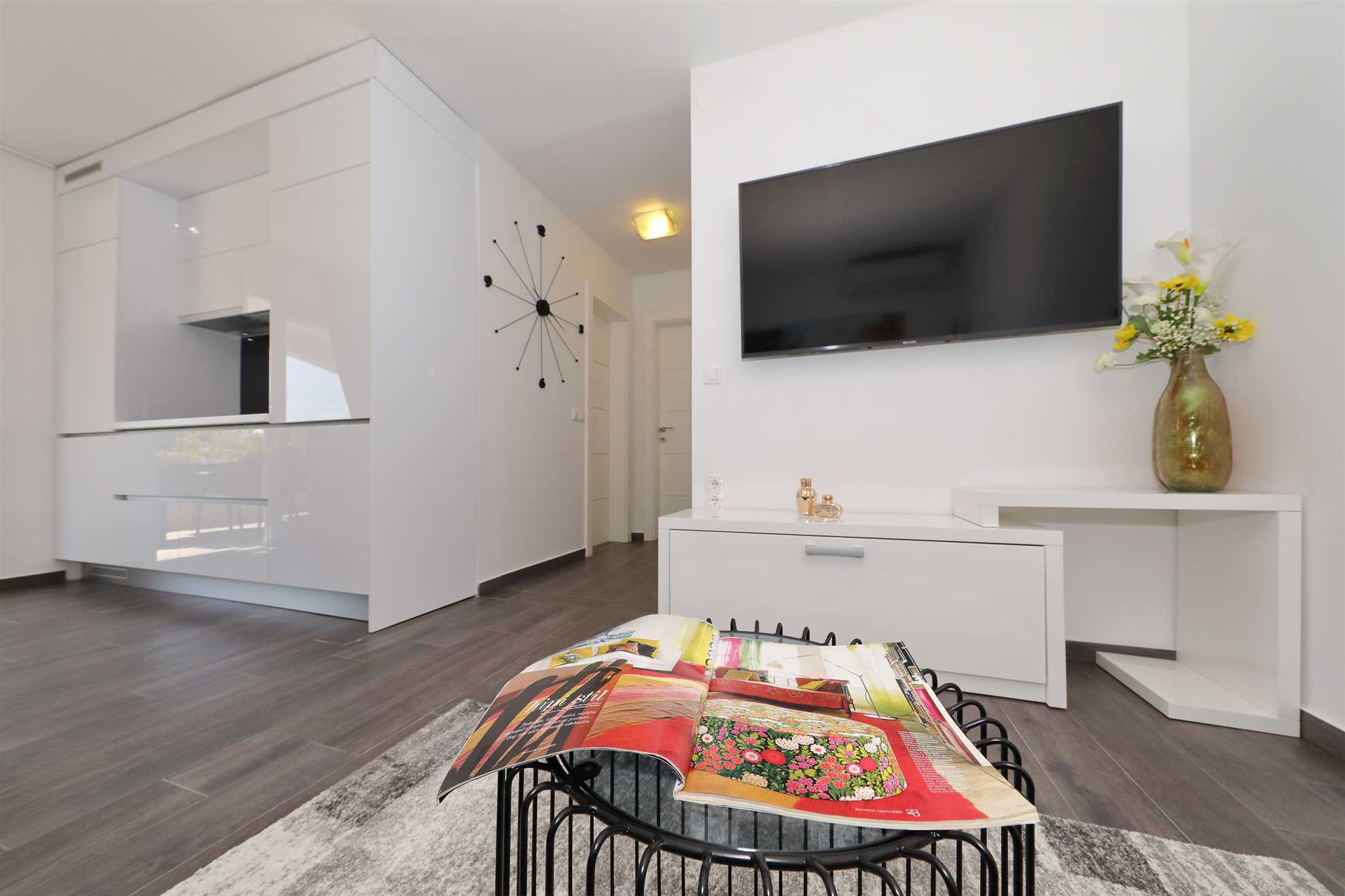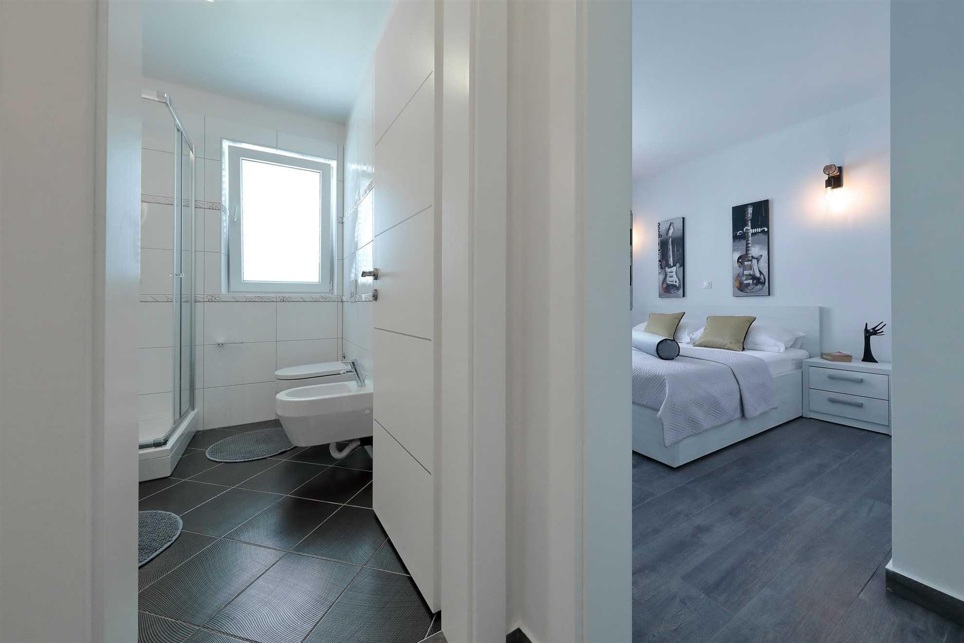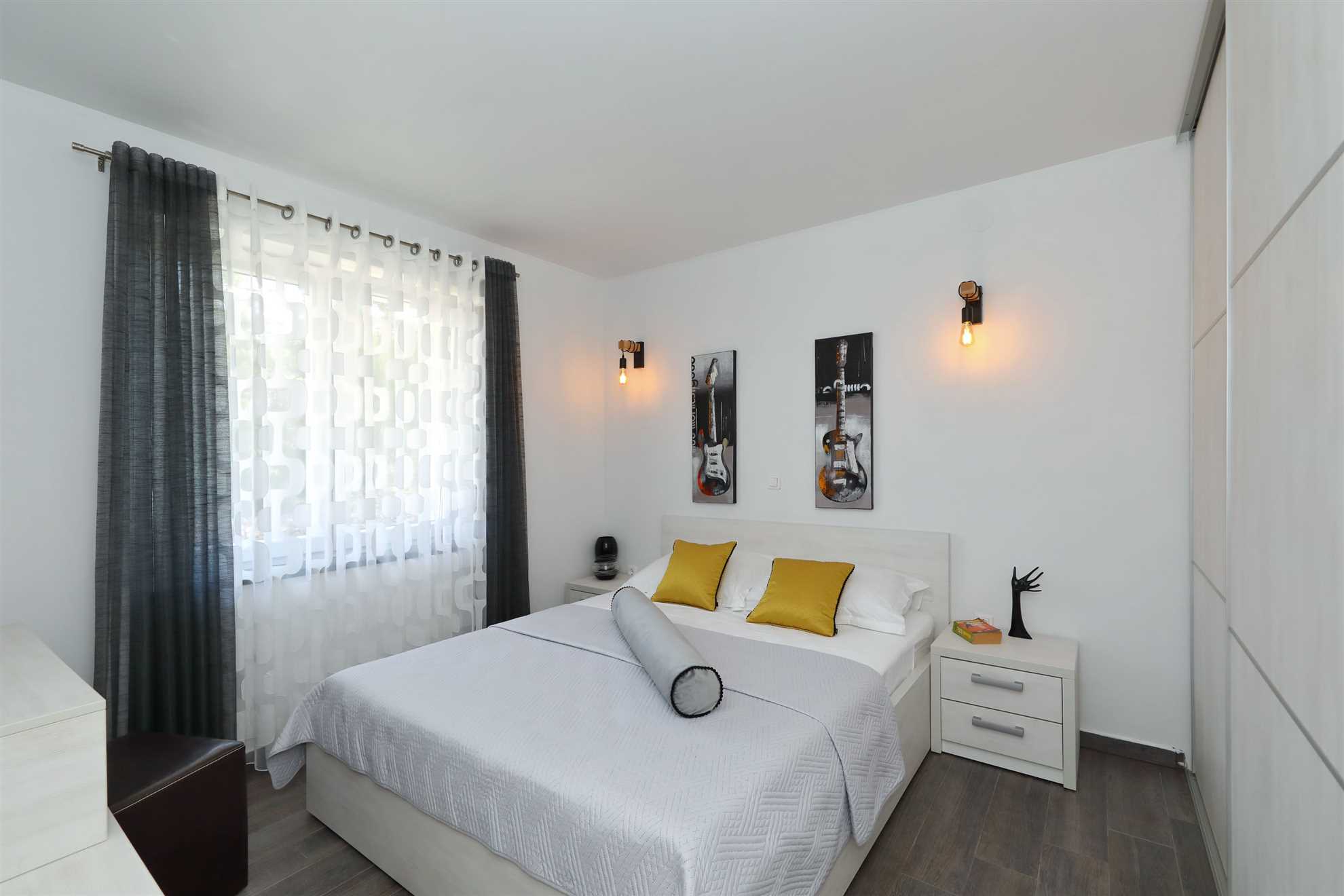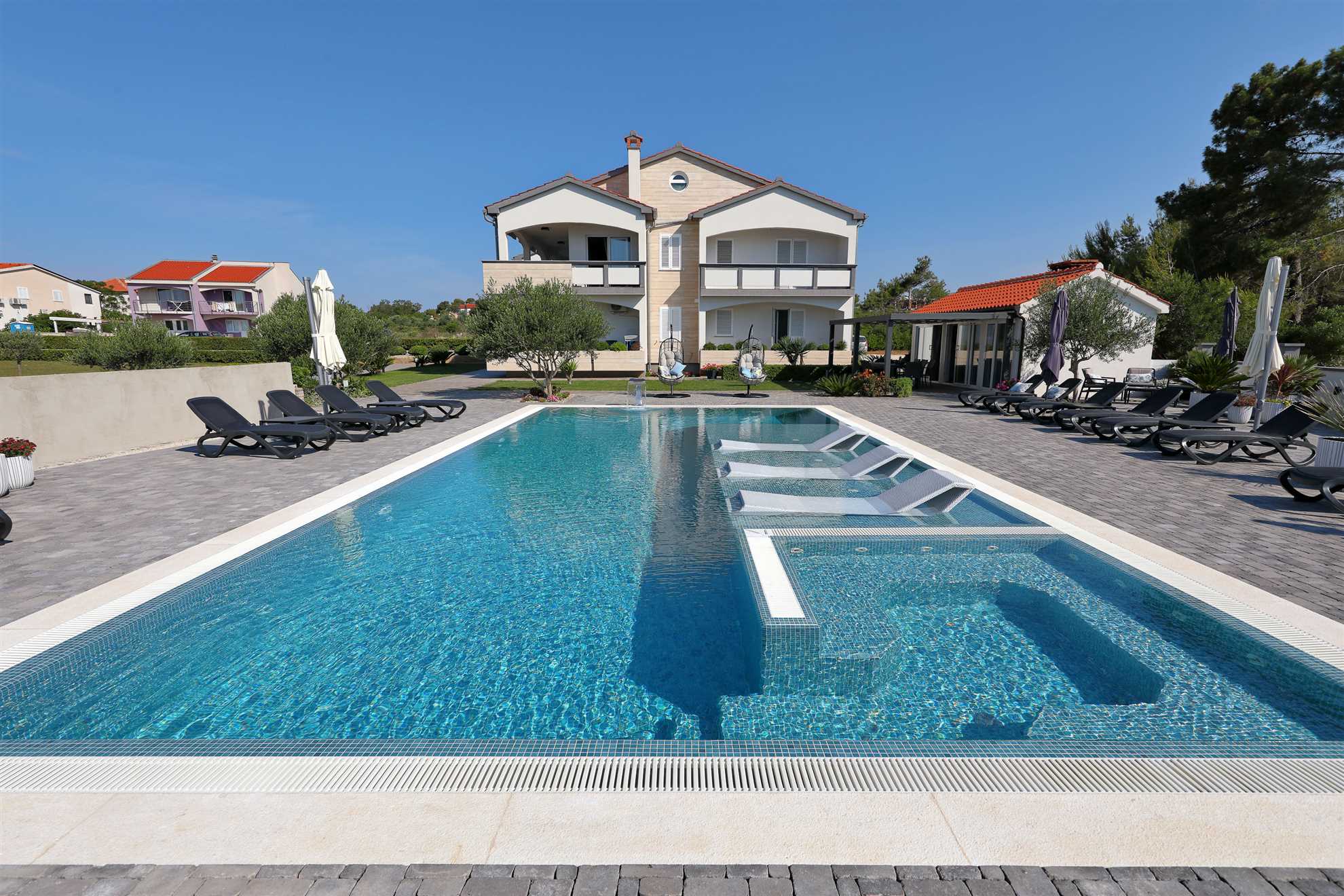 Unser modern eingerichtetes Apartment befindet sich in einer 4-Sterne-Villa direkt am Strand/an der Küste der Insel Vir. Es verfügt über einen 75 m² großen Infinity-Pool mit Whirlpool-Ecke und einen herrlichen Blick auf das Meer, die Bucht und die umliegenden Inseln. Das Apartment ist modern eingerichtet, luftig und hell. Es besteht aus einer Küche, einem Wohnzimmer, einem Schlafzimmer, einem Badezimmer und einer Terrasse. Die Küche ist komplett ausgestattet (Töpfe, Pfannen, Geschirr, Besteck, Mikrowelle, Toaster, Wasserkocher, Kaffeemaschine, Kühlschrank). Gegenüber der Küche befindet sich der Essbereich mit einem Tisch und Stühlen für vier Personen. Küche und Essbereich öffnen sich zum Wohnzimmer mit einem ausziehbaren Schlafsofa, einem Schaukelstuhl, einem Flachbildfernseher mit Satellitenempfang und einer Klimaanlage. Das Schlafzimmer ist mit einem Doppelbett, Nachttischen und einem Einbauschrank ausgestattet. Direkt neben dem Schlafzimmer befindet sich das Badezimmer mit Dusche. Die Terrasse ist durch die Küche zugänglich und mit einem Tisch und Stühlen möbliert. Den Gästen steht die Umgebung des Hauses zur Verfügung, darunter der Garten/Grillhaus (mit Küchenzeile), der Infinity-Pool mit Whirlpool-Ecke und Liegestühlen, ein Parkplatz und eine Garage. In der Garage können die Gäste unter anderem Motorräder, Fahrräder und aufblasbare Wassersportgeräte (Matratzen, Boote usw.) unterstellen. Die Gäste haben ihre Privatsphäre, aber einer von uns steht ihnen jederzeit zur Verfügung, falls sie etwas benötigen. In der Nähe befinden sich zahlreiche Parks und Orte mit unberührter Natur. Nationalparks mit reicher Flora und Fauna sowie Flüsse mit kristallklarem Wasser, wie zum Beispiel der Fluss Zrmanja, der sich ideal zum Rafting eignet, liegen etwa 15 km vom Haus entfernt. Das spektakuläre Velebit-Gebirge, geschützt durch den Nationalpark „Paklenica“ (ca. 60 km), bietet wunderschöne Wander-, Jogging- und Radwege (über 200 km lang) sowie zahlreiche Möglichkeiten zum Klettern und Bungee-Jumping. Dieses relativ kleine Gebiet weist eine Fülle geomorphologischer Phänomene und Formen auf, wie zum Beispiel „Manita peć“ und „Cerovačke pećine“. Sie können auch „in die Fußstapfen“ des Films „Winnetou“ treten, der in Paklenica gedreht wurde. Auf der anderen Seite sind die 89 Karstinseln, Inselchen und Riffe des Nationalparks Kornati, oft als „nautisches Paradies“ bezeichnet, mit einer eintägigen Bootsfahrt von Zadar aus zu erreichen. Die nächste Bushaltestelle befindet sich 1 km entfernt, neben der Inselkirche oder auf dem Platz neben dem Restaurant „Viranka“. Die Buslinie verbindet die Insel mit der nächstgrößeren Stadt, Zadar. Die Linie verkehrt etwa stündlich. Die Insel verfügt auch über einen eigenen Taxiservice. Es gibt auch organisierte Bootsausflüge vom Inselzentrum aus (Buchung im Touristeninformationsbüro). Das Haus liegt in einer ruhigen Gegend am Rande des Stadtzentrums. Das Zentrum ist zu Fuß erreichbar (ca. 5 Minuten) und alles ist ganz in der Nähe, jedoch ohne den üblichen Trubel einer geschäftigen Innenstadt. Der nächste Lebensmittelladen ist ca. 1 km entfernt. Das nächste Restaurant befindet sich im Umkreis von 800 Metern. Der Strand liegt direkt vor dem Haus.