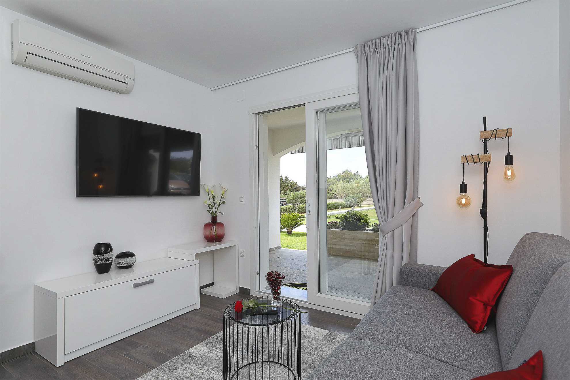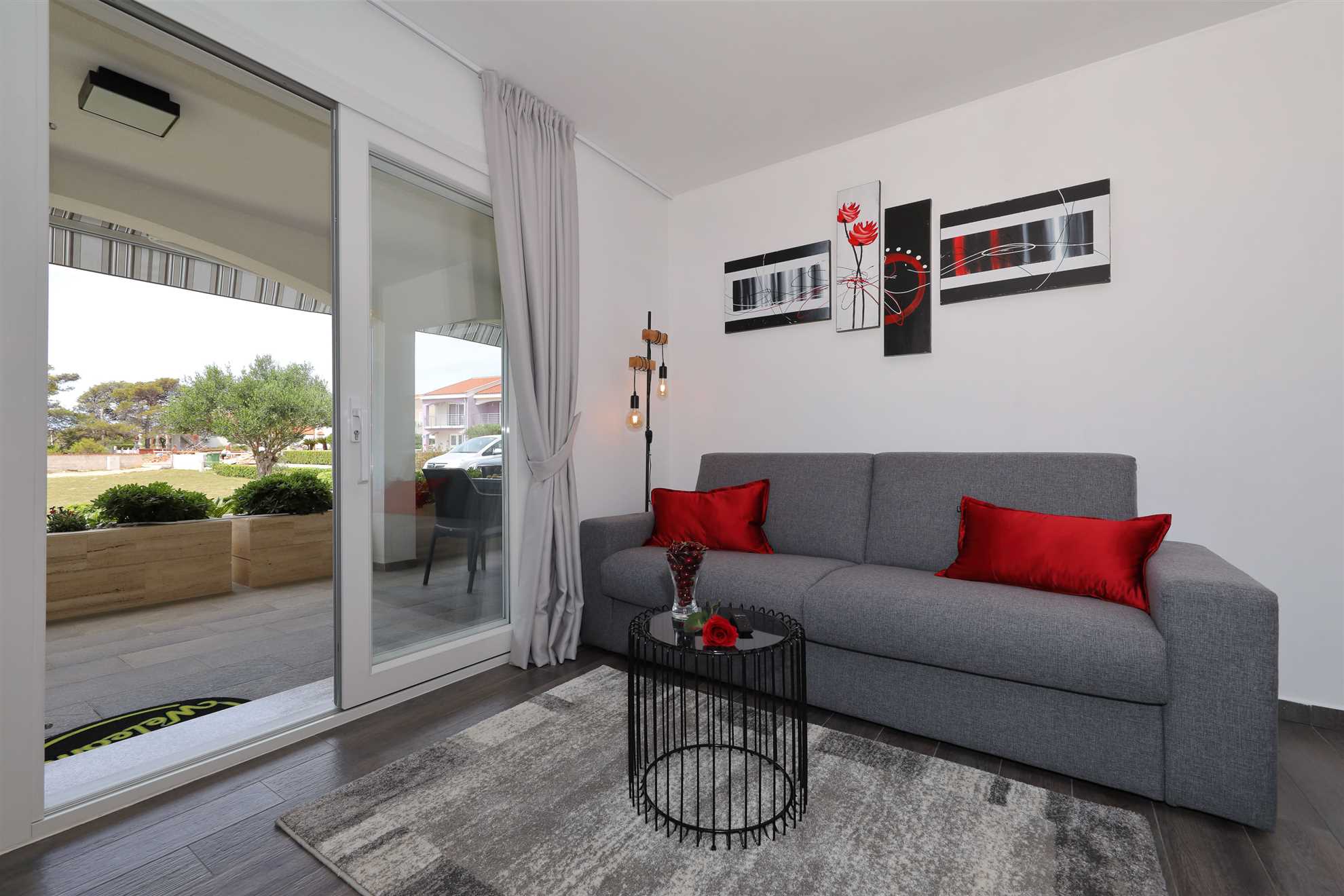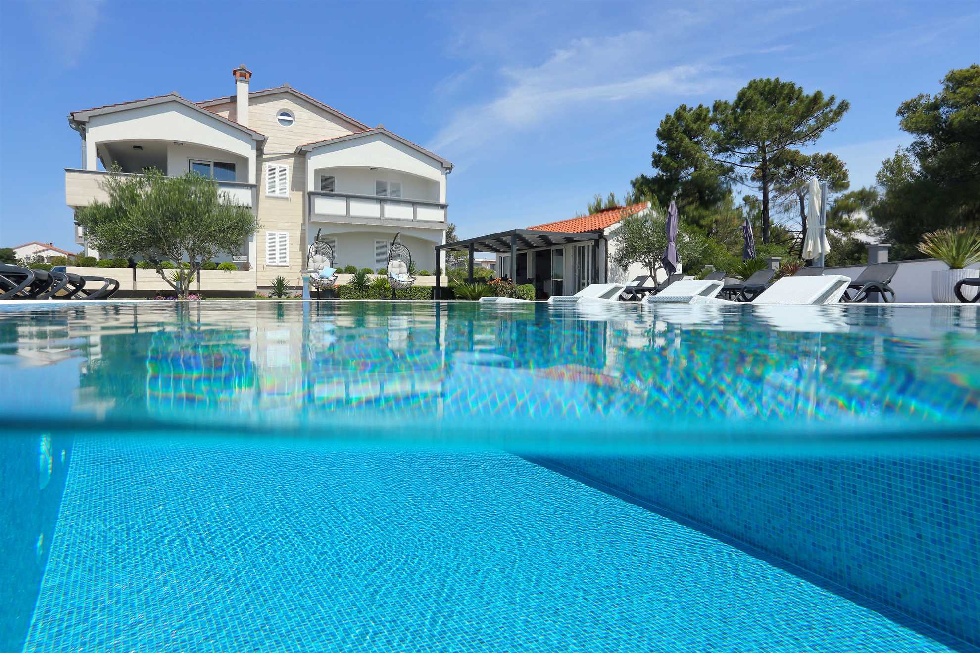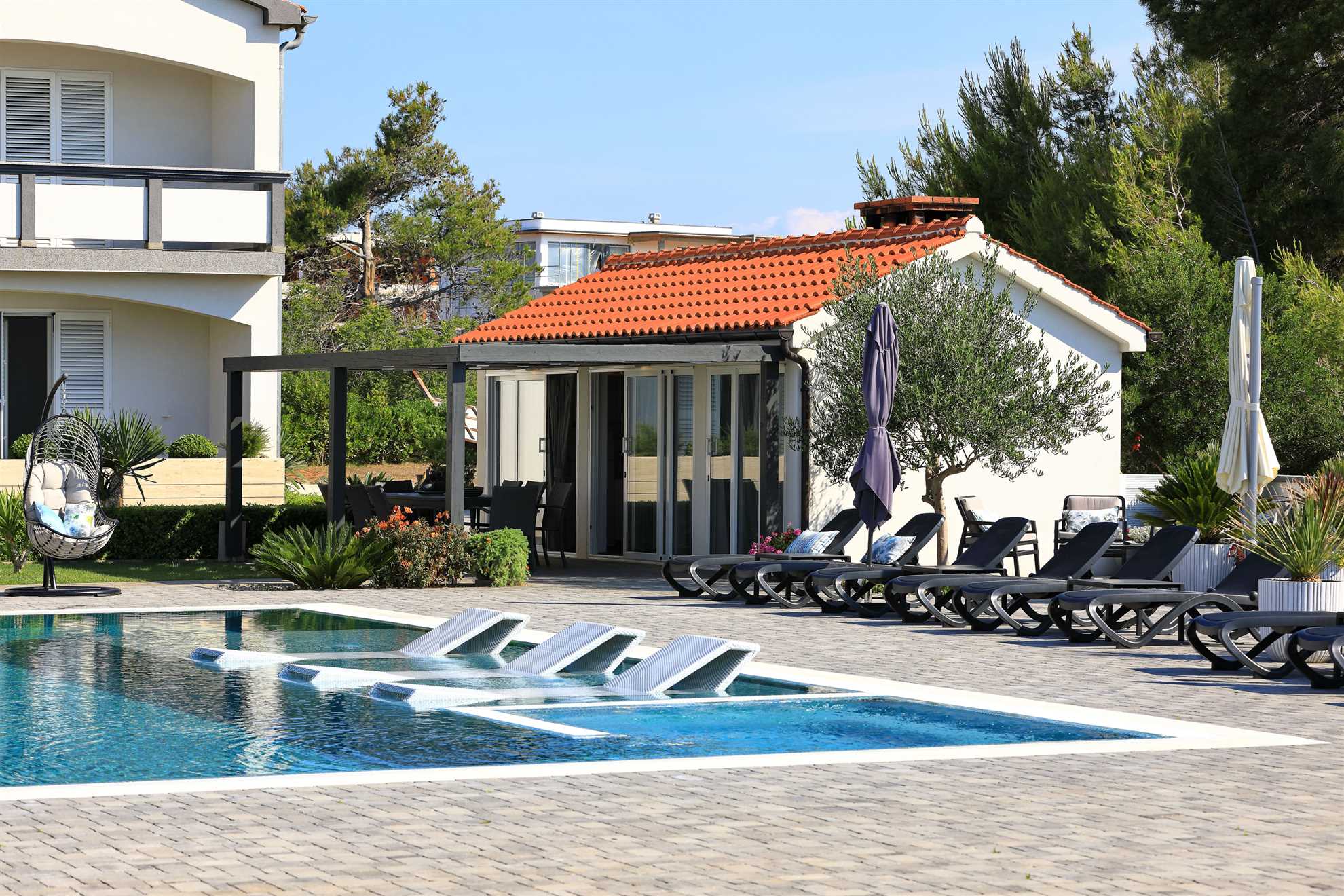 Suva Punta auf der Insel Vir in Norddalmatien, bietet Ihnen ein 40 qm Großes modernes Apartment mit großem Pool (60 qm) und einer möblierten Terrasse (15 qm) zum Entspannen.Das lichtdurchflutete und klimatisierte Apartment mit modernem Duschbad, bietet ein Doppelbett Schlafzimmer, einen offenen Wohnraum mit komfortablen Sofa welches nach Bedarf zu zwei weiteren Schlafplätzen umfunktioniert werden kann. Die moderne Küche mit Essplatz, bietet alle Annehmlichkeiten die ... Am besten geeignet für 1 Person. Bietet Platz für maximal 4 Personen. Größe: 50 m² Sie haben das gesammte Apartment für sich mit eigenem Eingang ins Apartment. Wir lassen den Gästen ihren Freiraum sind jedoch immer erreichbar. zum Strand: 0.01km zur Badestelle/Gewässer: 0.01km zum Zentrum: 0.5km zum Wanderweg: 0.2km zum Bäcker: 0.3km zum Supermarkt: 0.3km zum Restaurant: 0.3km Die Umgebung unserer Ferienunterkunft bietet zahlreiche Möglichkeiten für einen abwechslungsreichen Aufenthalt. Einkaufsmöglichkeiten sind in nur ca. 300 m Entfernung zu finden, somit können Sie bequem zu Fuß Ihre Besorgungen erledigen. Der Strand ist sogar nur ca. 5 m entfernt und lädt zu entspannten Spaziergängen oder ausgiebigen Sonnenbädern ein.Auch die Ortsmitte ist in ca. 500 m Entfernung schnell zu erreichen. Hier finden Sie weitere Geschäfte und Restaurants, die zum Bummeln und Schlemmen einladen. Wenn Sie nicht weit laufen möchten, können Sie auch unser hauseigenes Restaurant in nur ca. 300 m Entfernung besuchen.Unsere Unterkunft ist für verschiedene Zielgruppen geeignet. Familien mit Kindern, Geschäftsreisende, Motorradfahrer, Radfahrer, Reisegruppen, Reiter, Senioren und Sportbegeisterte finden bei uns die passende Unterkunft. Die direkte Strandlage bietet sich besonders für einen erholsamen Strand- und Badeurlaub an. Aber auch für Aktivitäten wie Wandern, Walking, Wassersport oder einfach nur entspanntes Spielen am Strand ist unsere Unterkunft ideal.Die Lage unserer Unterkunft ist ebenso von Vorteil. Sie befindet sich direkt am Strand-Zugang und bietet somit einen unmittelbaren Zugang zum Meer. Zudem ist es hier ruhig und trotzdem zentral gelegen. Somit können Sie die Vorzüge der Strandnähe genießen, ohne auf eine zentrale Lage zu verzichten. Bei uns erwartet Sie ein erholsamer und abwechslungsreicher Urlaub in einer attraktiven Umgebung. zum Flughafen: 40.0km ... benötigt werden. Vom Wohnraum aus gelangen Sie auf die Terrasse mit Meerblick, auf der es sich noch schöner speisen lässt.Entspannen Sie am Pool auf den Sonnenliegen, oder aber nutzen Sie das Grillhäuschen um tolle Grillabende im Beisammensein zu verbringen. Dort steht ein großer gemauerter Grill mit gemütlichen Sitzmöglichkeiten für Sie bereit.Kostenloses W-LAN und genügend Parkplätze sind vorhanden.Auf dem 2000 qm großen Grundstück verbringen Sie Ihren Urlaub in ruhiger Lage, aber dennoch Zentral.Haustiere sind nicht gestattet. Suva Punta auf der Insel Vir in Norddalmatien, bietet Ihnen ein 40 qm Großes modernes Apartment mit großem Pool (60 qm) und einer möblierten Terrasse (15 qm) zum Entspannen.Das lichtdurchflutete und klimatisierte Apartment mit modernem Duschbad, bietet ein Doppelbett Schlafzimmer, einen offenen Wohnraum mit komfortablen Sofa welches nach Bedarf zu zwei weiteren Schlafplätzen umfunktioniert werden kann. Die moderne Küche mit Essplatz, bietet alle Annehmlichkeiten die benötigt werden. Vom Wohnraum aus gelangen Sie auf die Terrasse mit Meerblick, auf der es sich noch schöner speisen lässt.Entspannen Sie am Pool auf den Sonnenliegen, oder aber nutzen Sie das Grillhäuschen um tolle Grillabende im Beisammensein zu verbringen. Dort steht ein großer gemauerter Grill mit gemütlichen Sitzmöglichkeiten für Sie bereit.Kostenloses W-LAN und genügend Parkplätze sind vorhanden.Auf dem 2000 qm großen Grundstück verbringen Sie Ihren Urlaub in ruhiger Lage, aber dennoch Zentral.Haustiere sind nicht gestattet. Folgende Sprachen werden gesprochen: kroatisch, tschechisch, englisch, deutsch, slowakisch