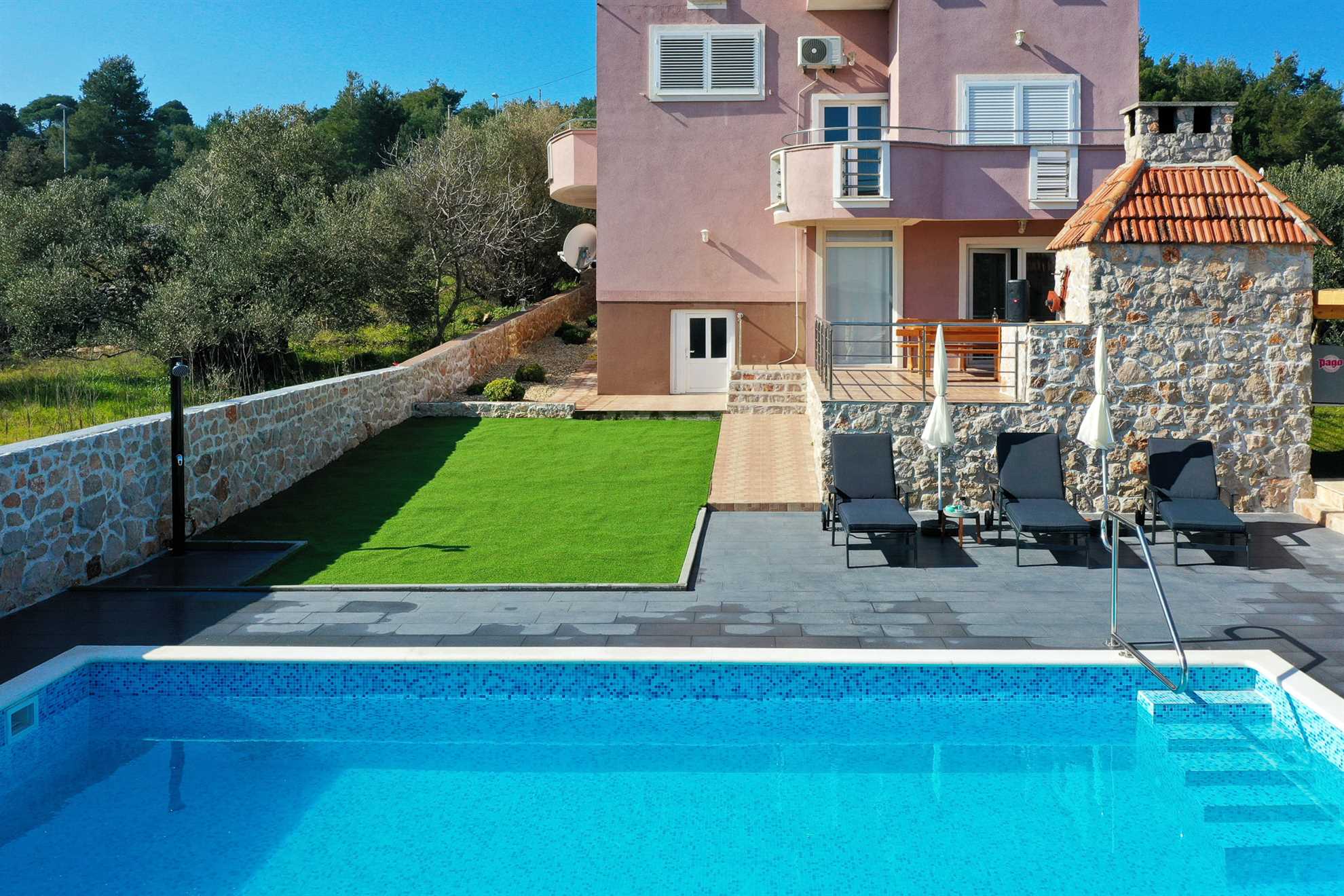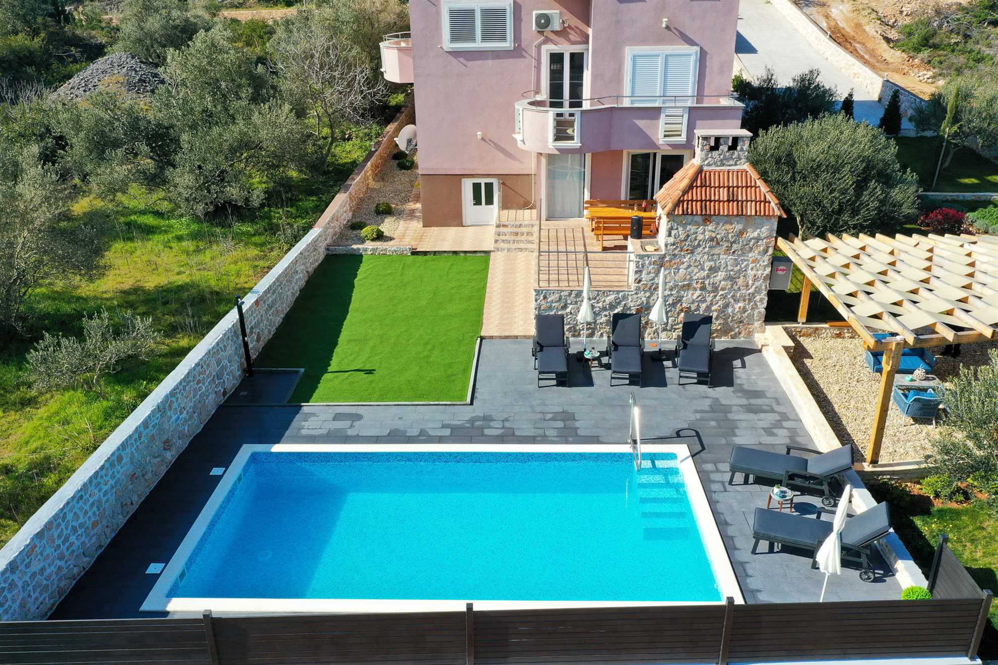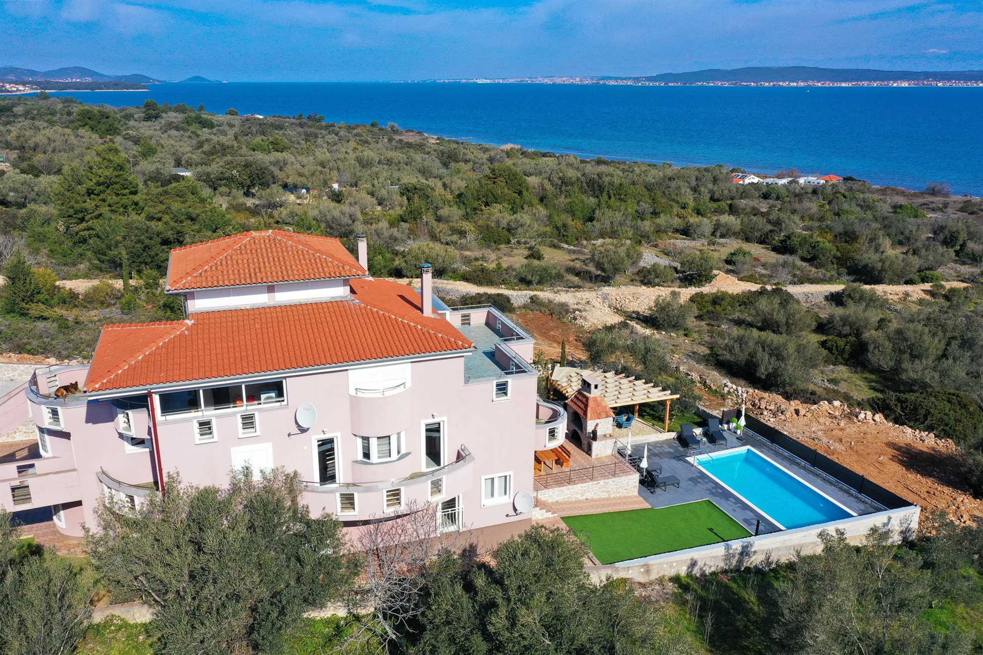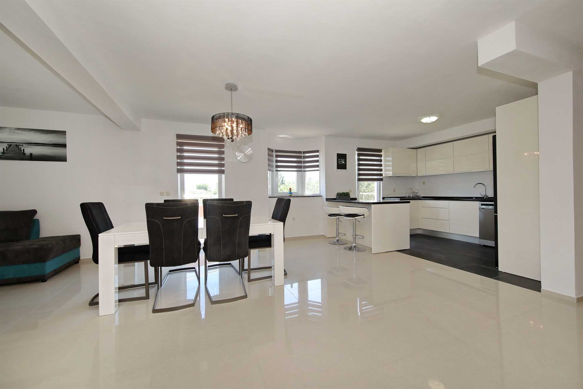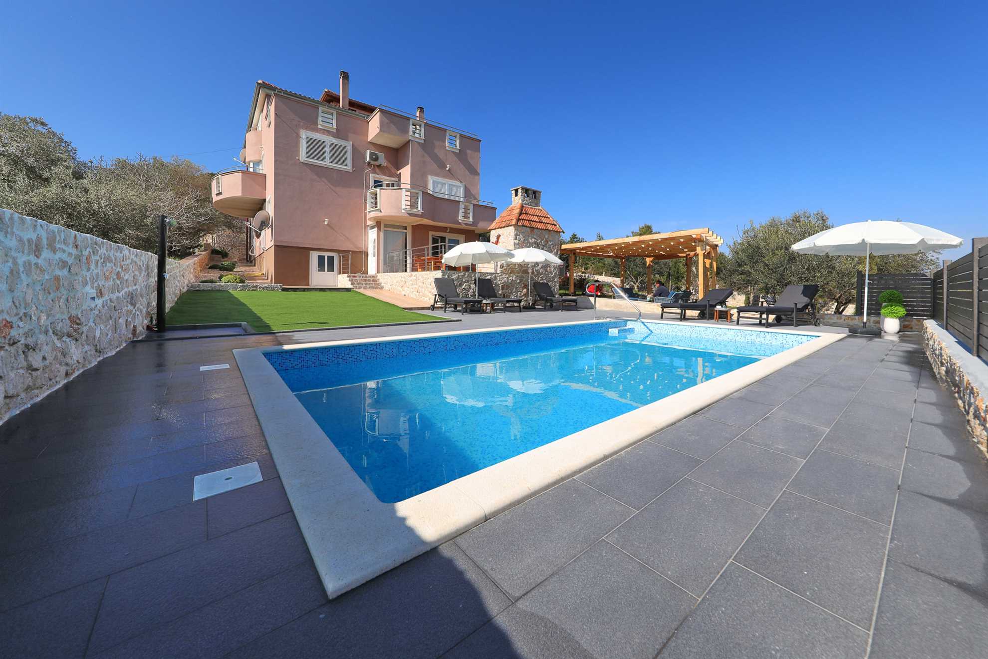 Apartment Luma is a spacious family apartment in Dobropoljana with a heated private pool, beautiful sea views and a quiet setting — ideal for guests who want to enjoy relaxing days together on Pašman. The property consists of two connected apartments rented exclusively as one large unit, offering plenty of space and privacy for groups of up to ten guests.Inside, you’ll find five bedrooms and three bathrooms — perfect for large families or several couples travelling together. The two living areas are bright and comfortable with direct access outdoors, and the well-equipped kitchens make shared meals easy: full-size fridge-freezer, oven, induction hob, dishwasher, coffee machine and ample tableware. Air conditioning and fast Wi-Fi ensure comfort throughout, while mosquito screens and blackout options support restful sleep. A baby cot and high chair are available.The private outdoor area includes everything needed for long summer days: heated pool with six sun loungers, spacious covered lounge area, stone barbecue, table tennis, trampoline and a well-kept garden. An outdoor shower provides refreshment after swimming, and dogs are welcome — up to two pets may stay. The nearest swimming spot is around 300 metres away, while the main beach is about 800 metres from the house.Dobropoljana is a peaceful village with authentic Dalmatian charm. A restaurant is about 850 metres away, a small supermarket around 900 metres, and with the island ferry, Zadar is an easy day trip. Pašman offers gentle bays, walking routes and a calm, family-friendly atmosphere.