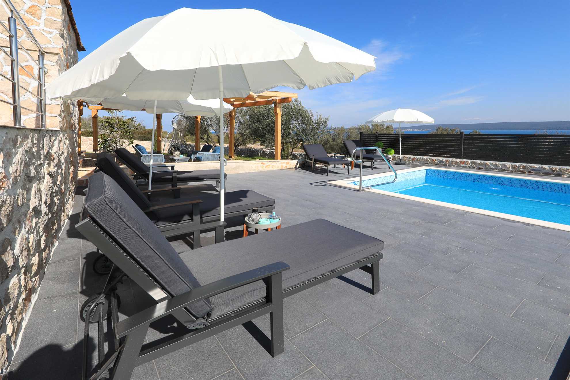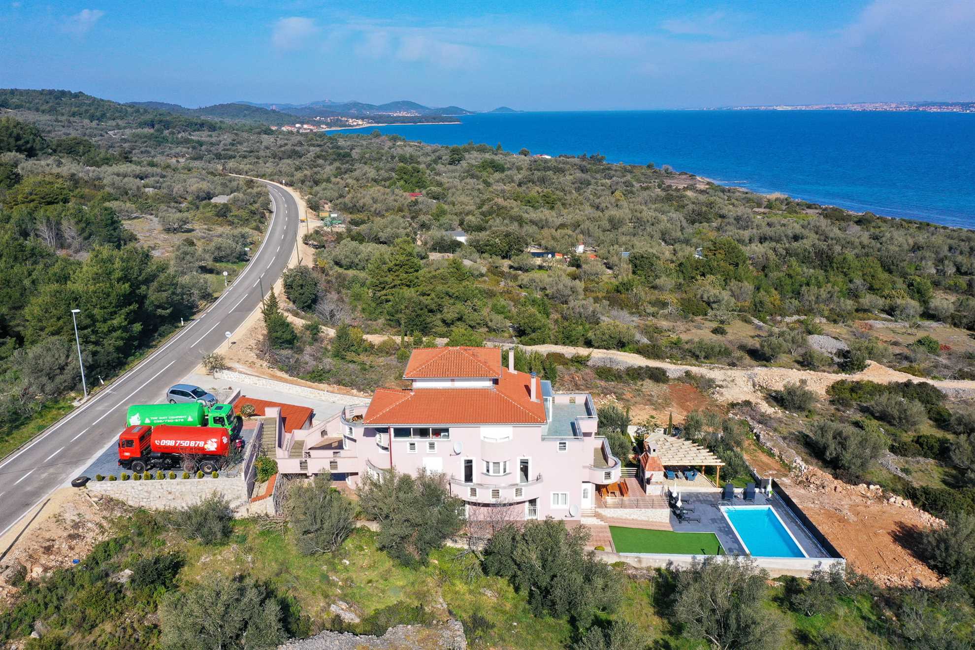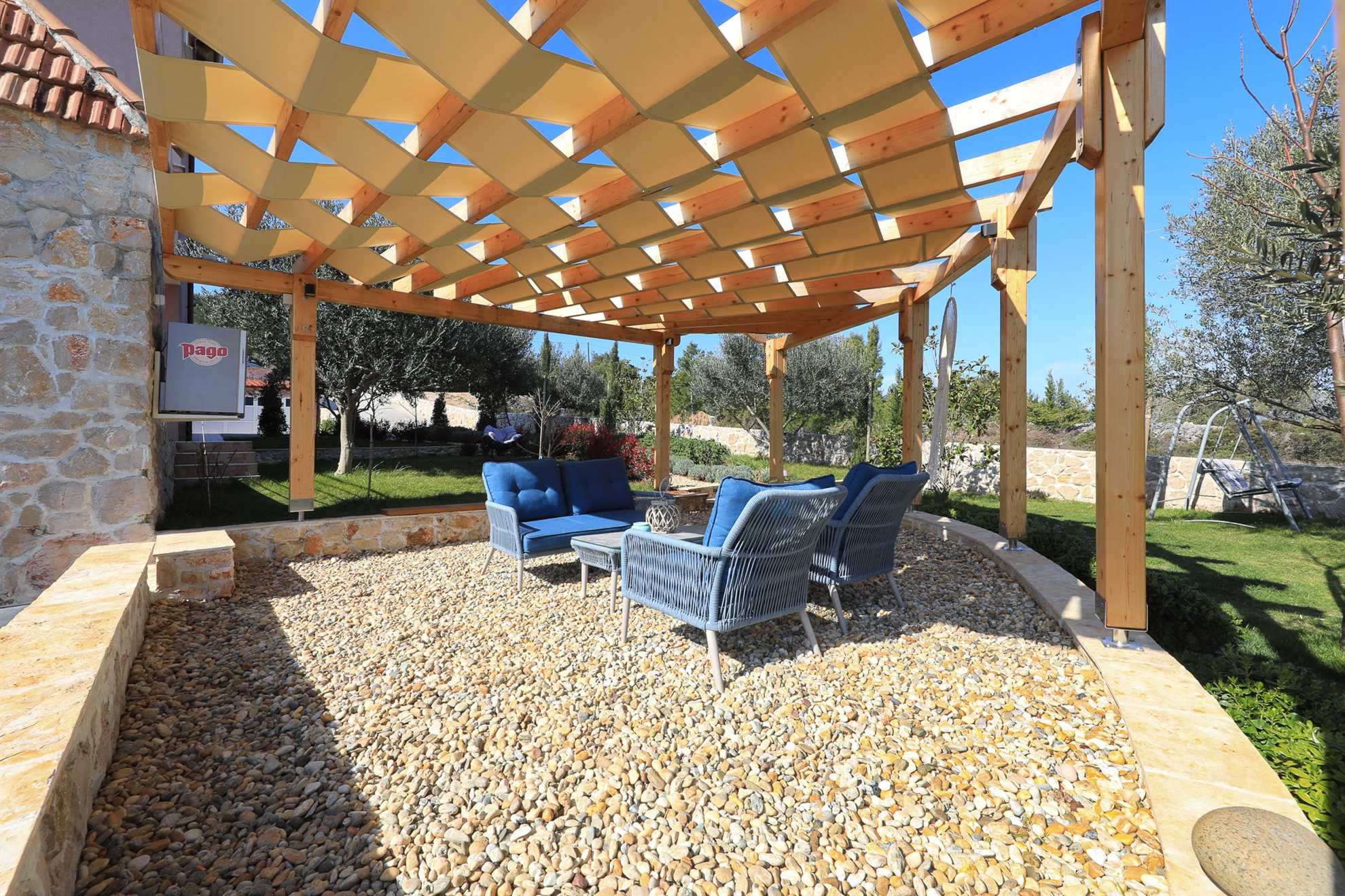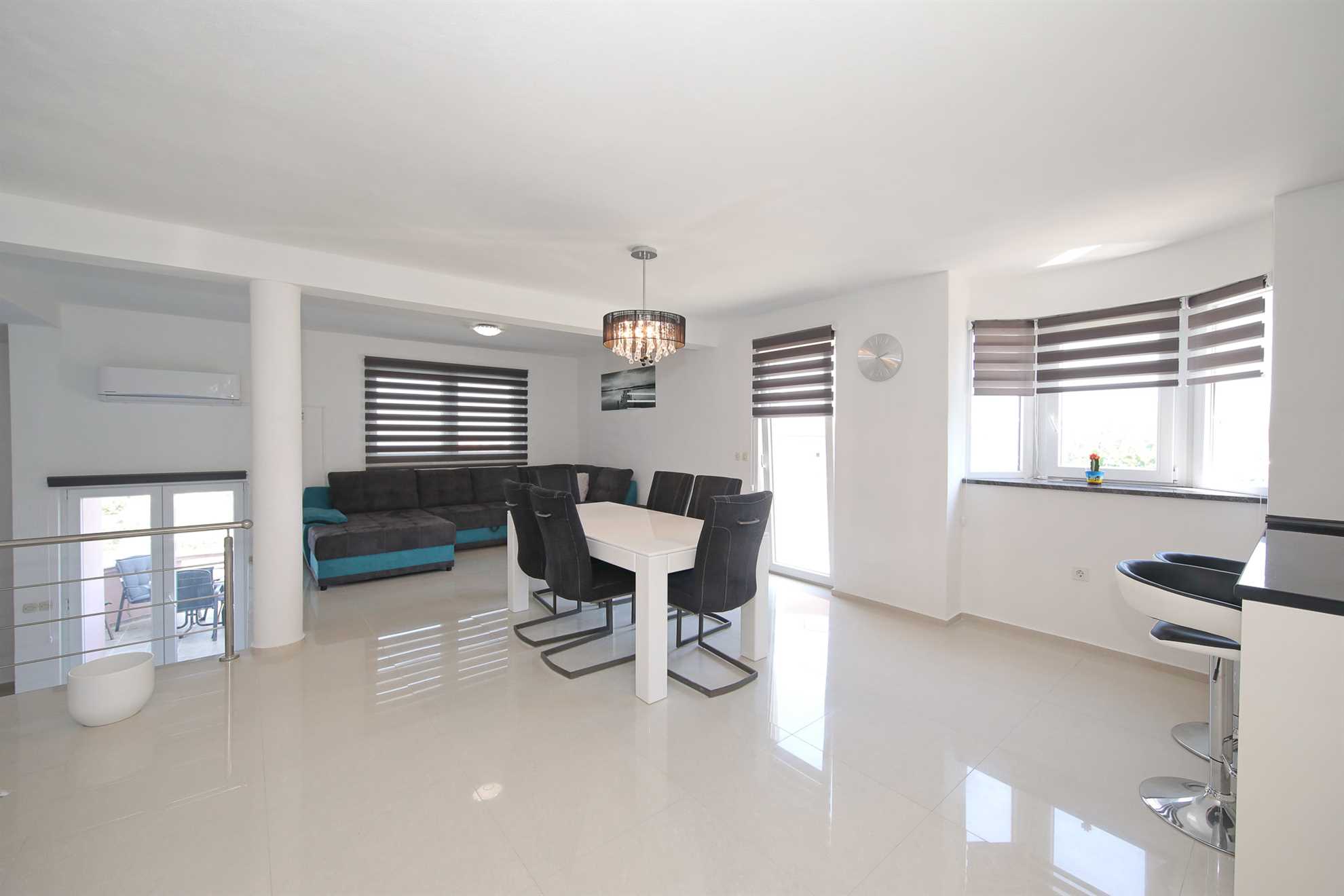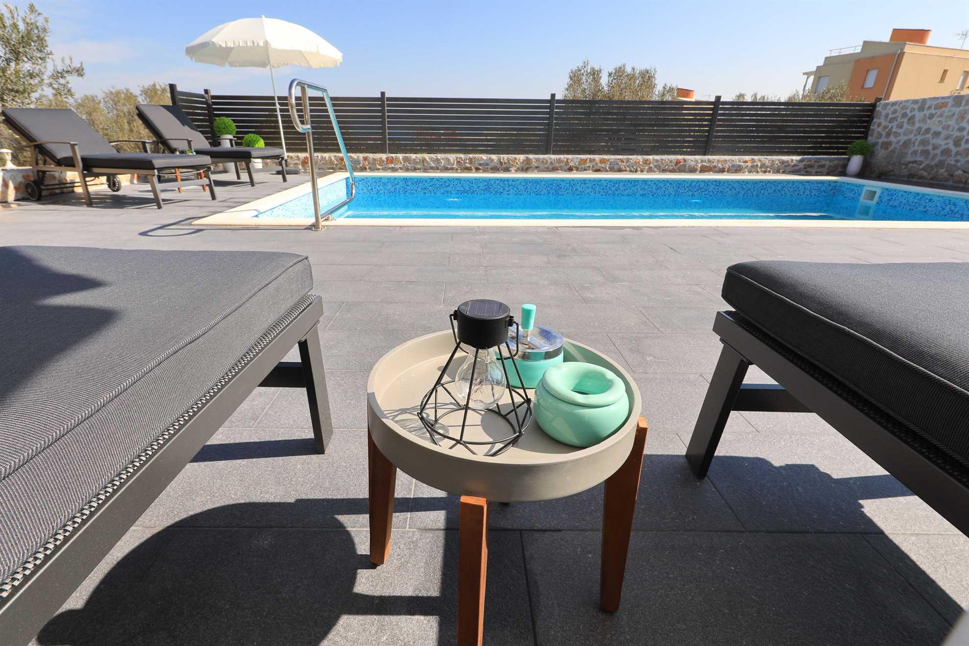 Apartment Luma is a spacious family apartment in Dobropoljana with a heated private pool, beautiful sea views and a quiet setting — ideal for guests who want to enjoy relaxing days together on Pašman. The property consists of two connected apartments rented exclusively as one large unit, offering plenty of space and privacy for groups of up to ten guests.Inside, you’ll find five bedrooms and three bathrooms — perfect for large families or several couples travelling together. The two living areas are bright and comfortable with direct access outdoors, and the well-equipped kitchens make shared meals easy: full-size fridge-freezer, oven, induction hob, dishwasher, coffee machine and ample tableware. Air conditioning and fast Wi-Fi ensure comfort throughout, while mosquito screens and blackout options support restful sleep. A baby cot and high chair are available.The private outdoor area includes everything needed for long summer days: heated pool with six sun loungers, spacious covered lounge area, stone barbecue, table tennis, trampoline and a well-kept garden. An outdoor shower provides refreshment after swimming, and dogs are welcome — up to two pets may stay. The nearest swimming spot is around 300 metres away, while the main beach is about 800 metres from the house.Dobropoljana is a peaceful village with authentic Dalmatian charm. A restaurant is about 850 metres away, a small supermarket around 900 metres, and with the island ferry, Zadar is an easy day trip. Pašman offers gentle bays, walking routes and a calm, family-friendly atmosphere.
