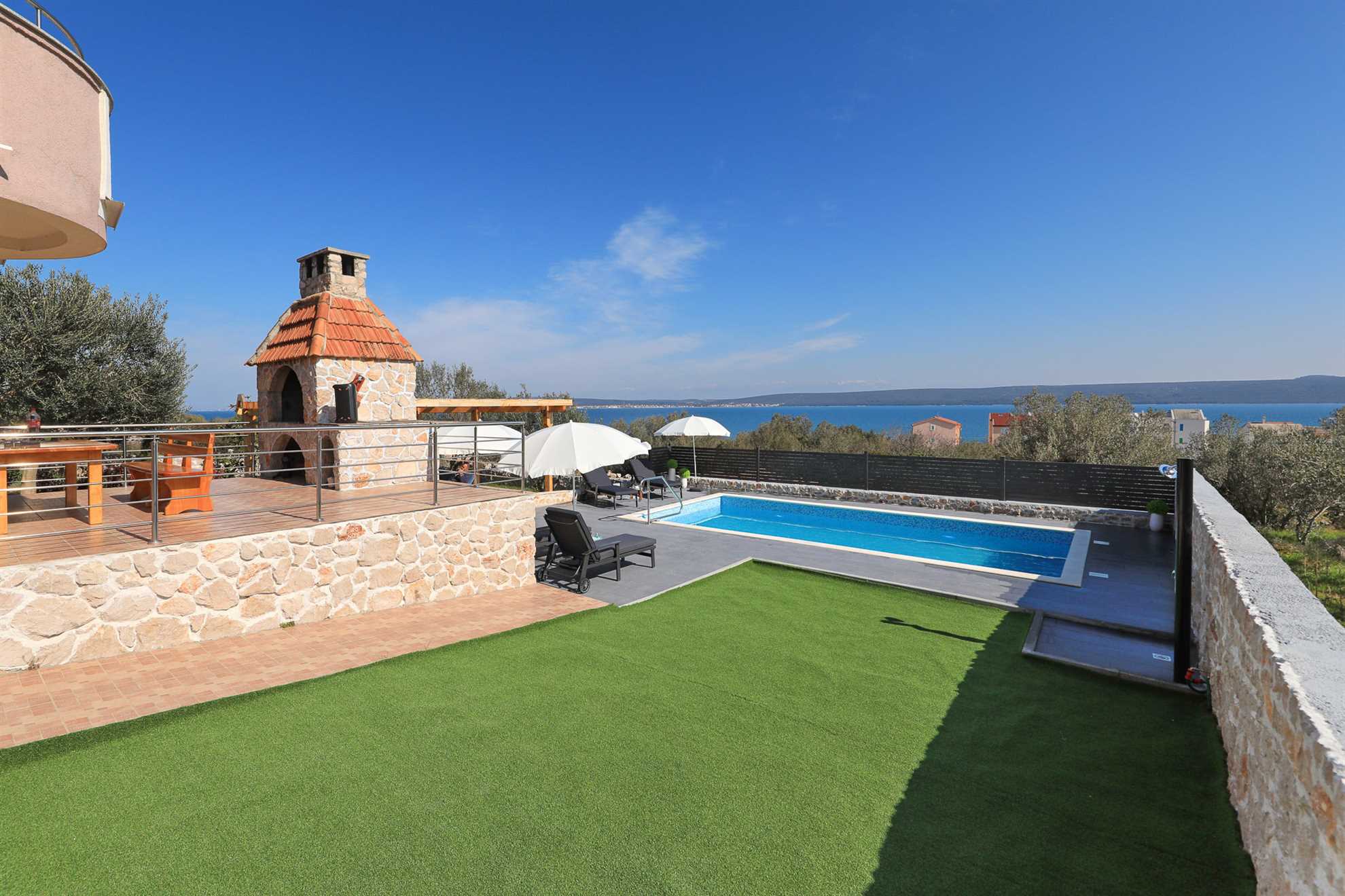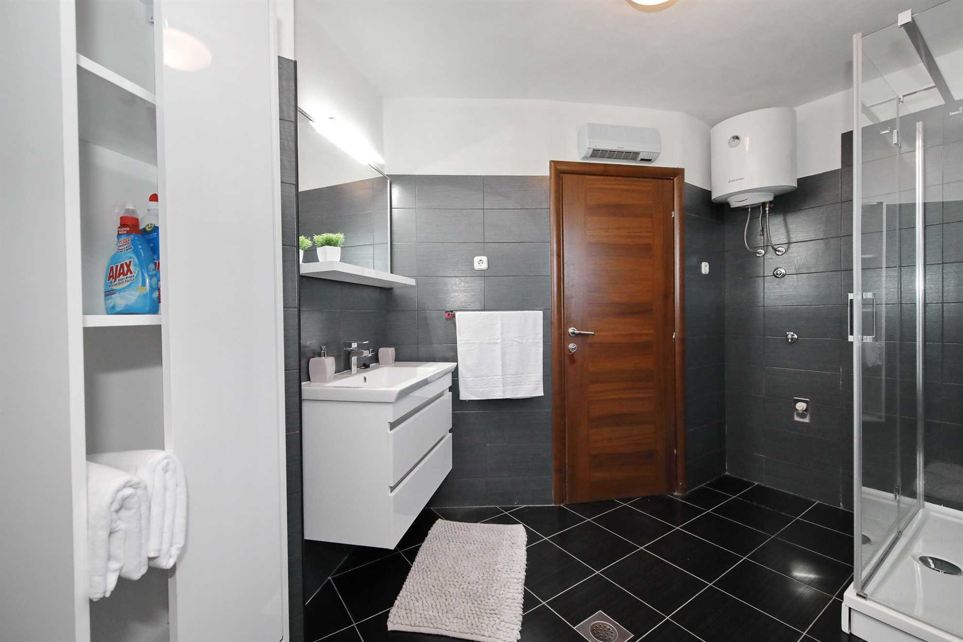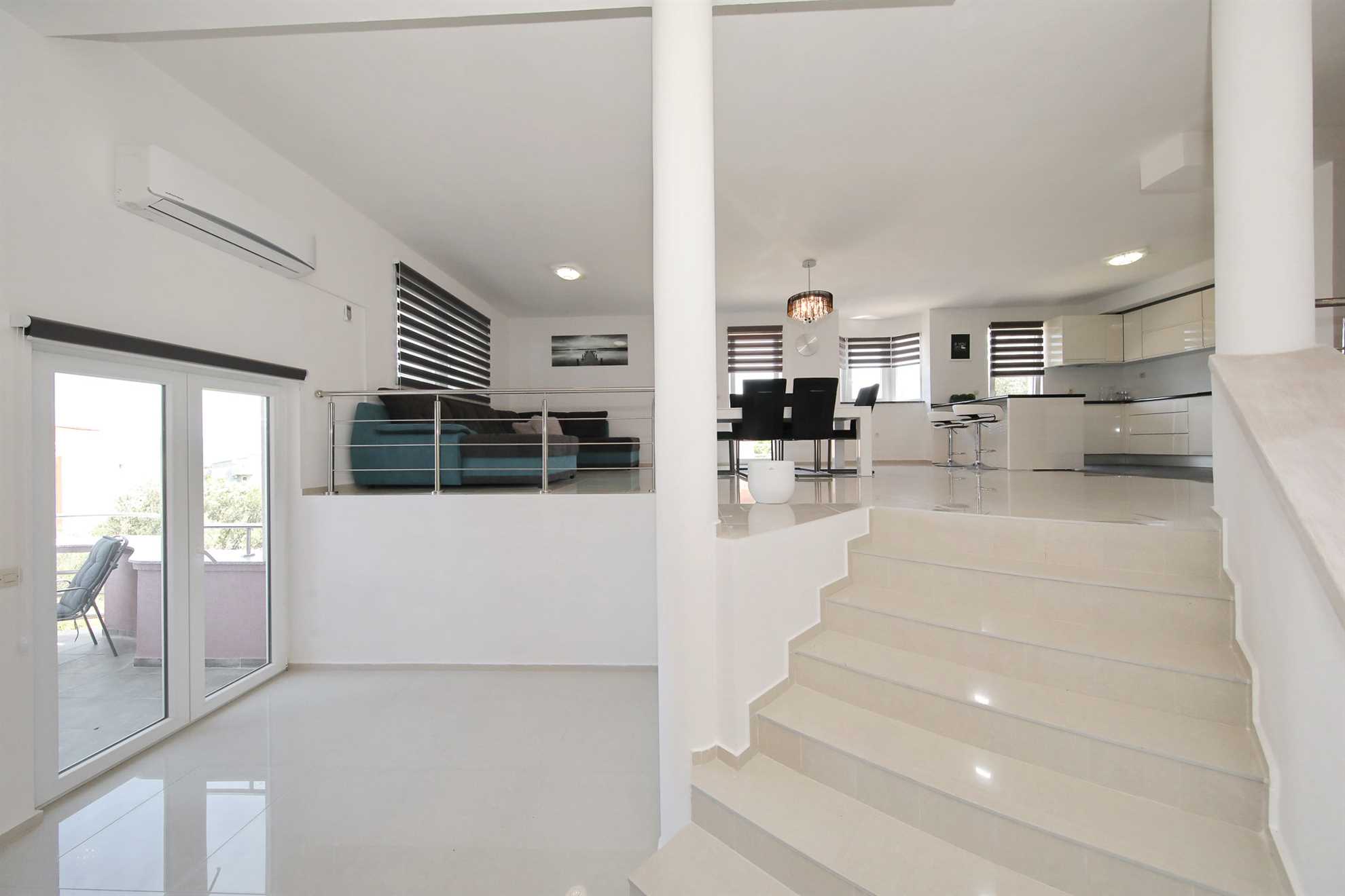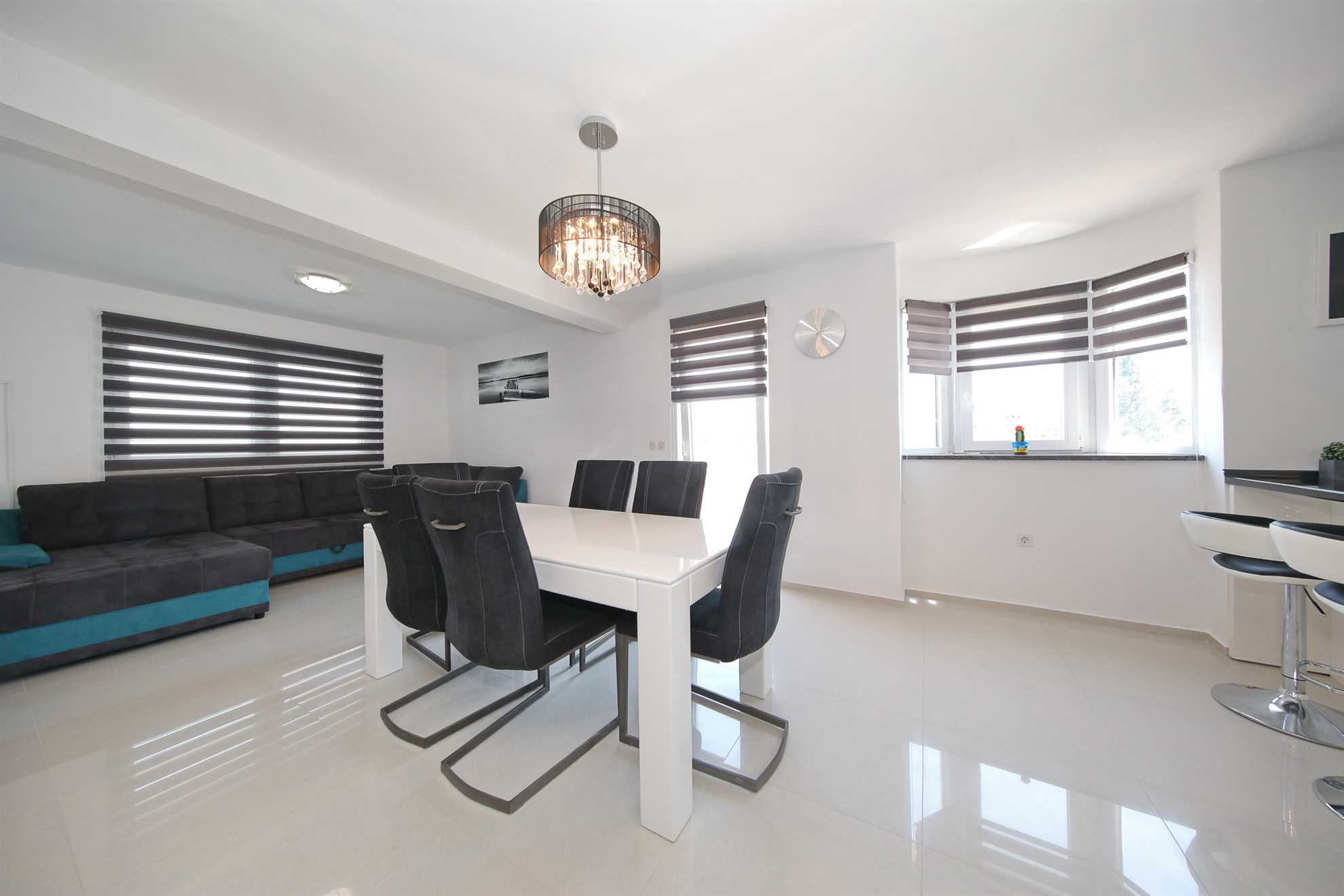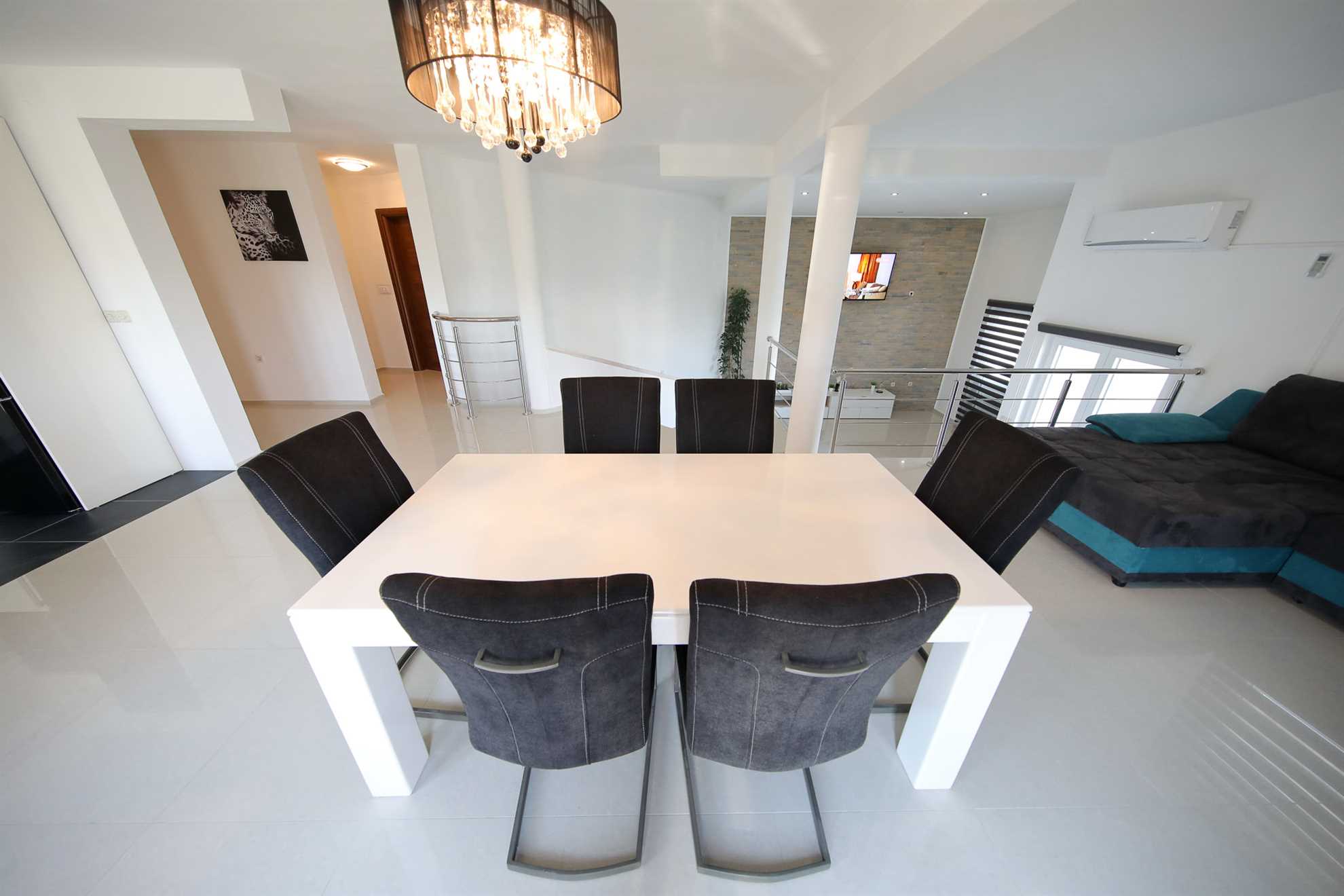 Apartment Luma is a spacious family apartment in Dobropoljana with a heated private pool, beautiful sea views and a quiet setting — ideal for guests who want to enjoy relaxing days together on Pašman. The property consists of two connected apartments rented exclusively as one large unit, offering plenty of space and privacy for groups of up to ten guests.Inside, you’ll find five bedrooms and three bathrooms — perfect for large families or several couples travelling together. The two living areas are bright and comfortable with direct access outdoors, and the well-equipped kitchens make shared meals easy: full-size fridge-freezer, oven, induction hob, dishwasher, coffee machine and ample tableware. Air conditioning and fast Wi-Fi ensure comfort throughout, while mosquito screens and blackout options support restful sleep. A baby cot and high chair are available.The private outdoor area includes everything needed for long summer days: heated pool with six sun loungers, spacious covered lounge area, stone barbecue, table tennis, trampoline and a well-kept garden. An outdoor shower provides refreshment after swimming, and dogs are welcome — up to two pets may stay. The nearest swimming spot is around 300 metres away, while the main beach is about 800 metres from the house.Dobropoljana is a peaceful village with authentic Dalmatian charm. A restaurant is about 850 metres away, a small supermarket around 900 metres, and with the island ferry, Zadar is an easy day trip. Pašman offers gentle bays, walking routes and a calm, family-friendly atmosphere.