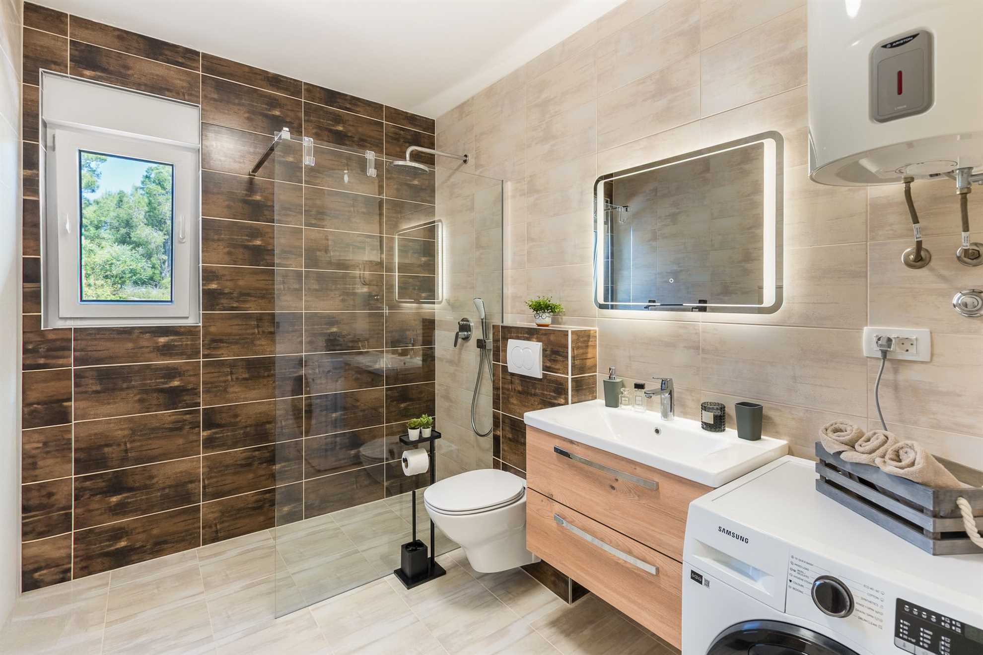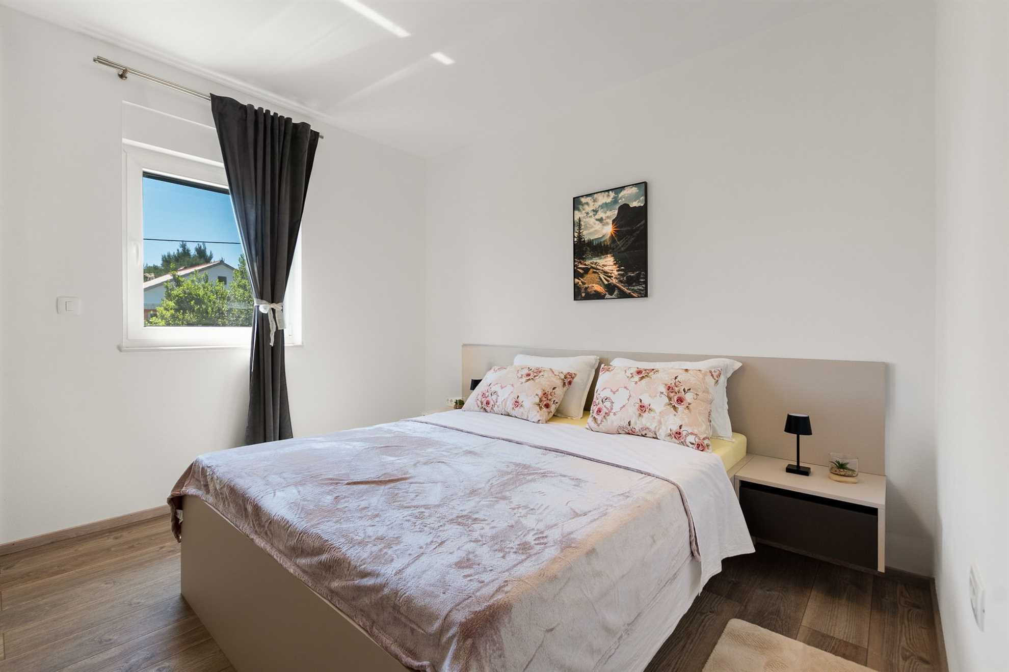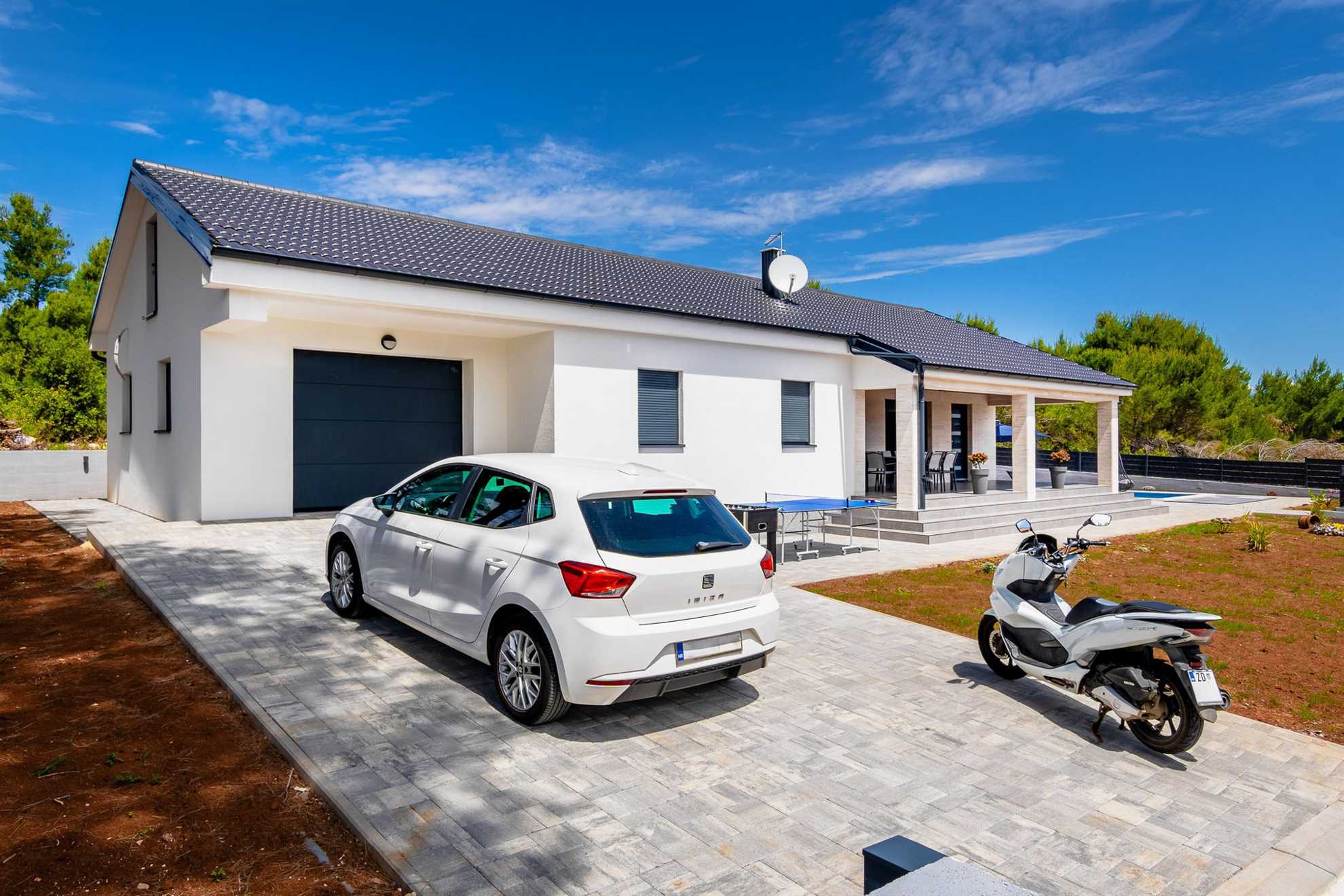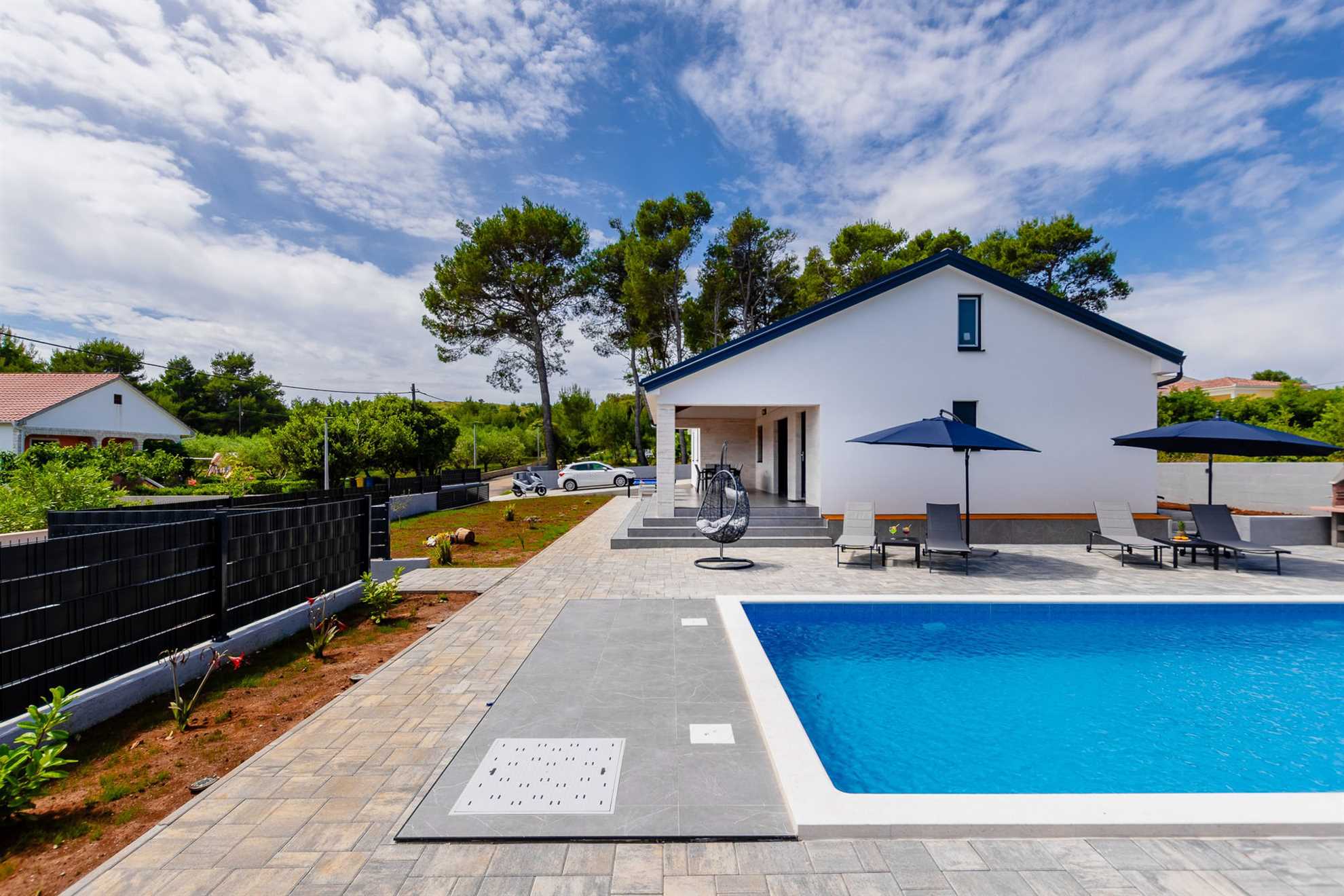 Welcome to Holiday Home Radovic, your perfect getaway on the beautiful island of Vir in Northern Dalmatia, Croatia. Just 1 km from the nearest beach, this family-friendly villa offers everything you need for a relaxing vacation under the Croatian sun. Enjoy lazy days by your private 36 m² outdoor pool with sun loungers, umbrellas, and an outdoor shower – the ideal place to unwind. The house features three comfortable bedrooms – two with queen-size beds (160×200 cm) and one with a king-size bed (180×200 cm) – as well as a modern bathroom with a walk-in shower and an additional separate toilet. The open-plan living area includes a spacious sofa, dining space, and a fully equipped kitchen for home-cooked meals. A smart TV, satellite TV, and free Wi-Fi are also available. Step outside to the large covered terrace, furnished with cozy garden furniture – perfect for dining al fresco or relaxing in the shade. The entire property is walled and enclosed, offering privacy and peace of mind for families with children. A barbecue, private garage, and additional free parking on the property are also included. Holiday Home Radovic is located in a quiet neighborhood with a low-traffic local road in front of the house. A restaurant is just 400 m away, and the town center of Vir is 3 km away. The home is ideal for up to 6 guests and includes a baby cot and high chair. Pets are welcome upon request. Discover the charm of island life and enjoy unforgettable moments at your private holiday home with pool on Vir!
