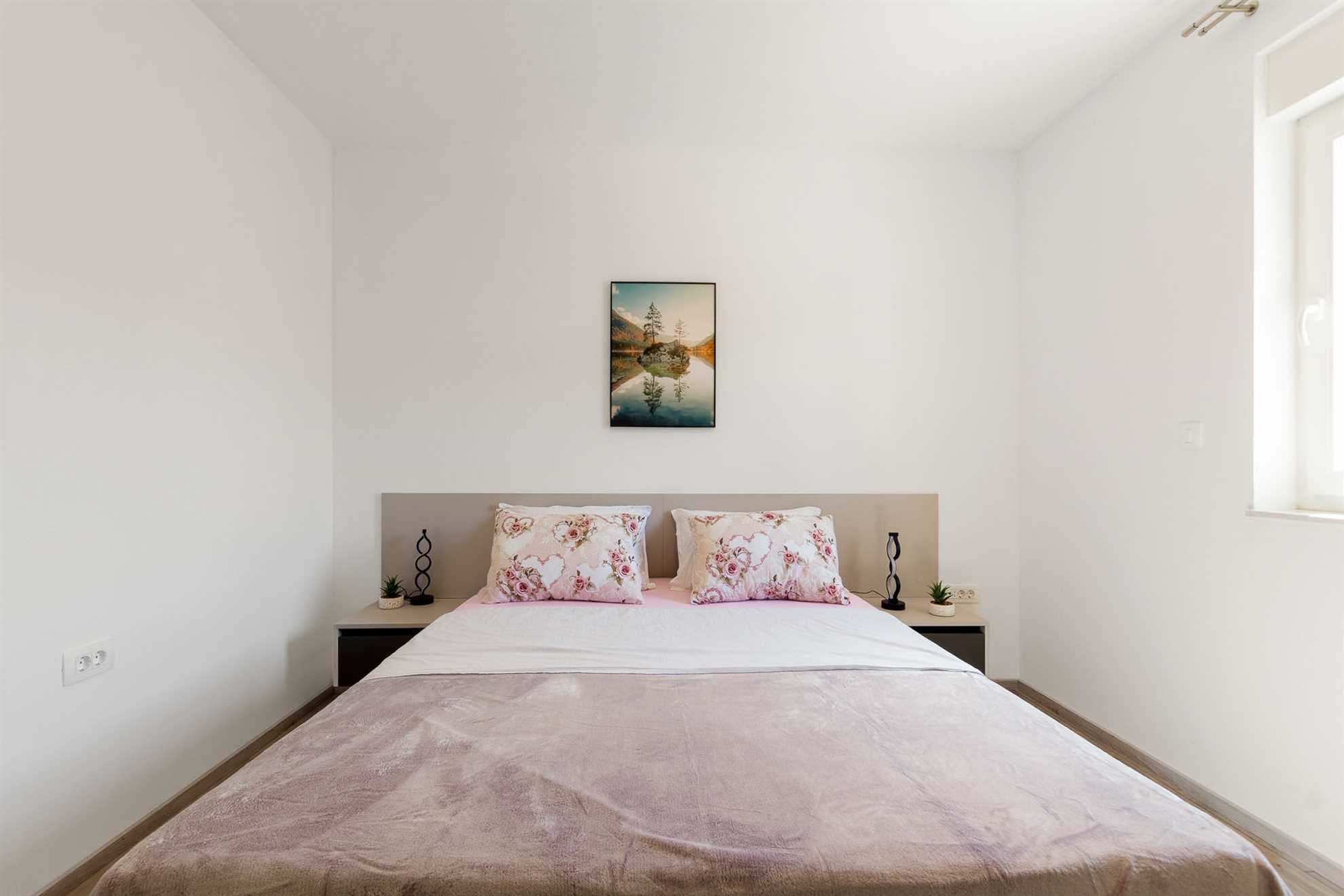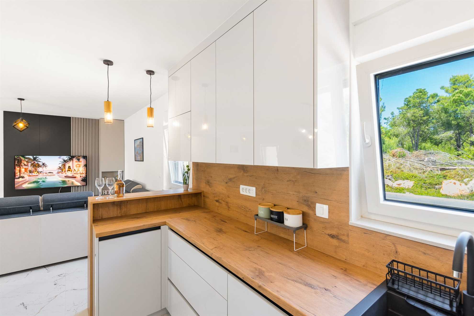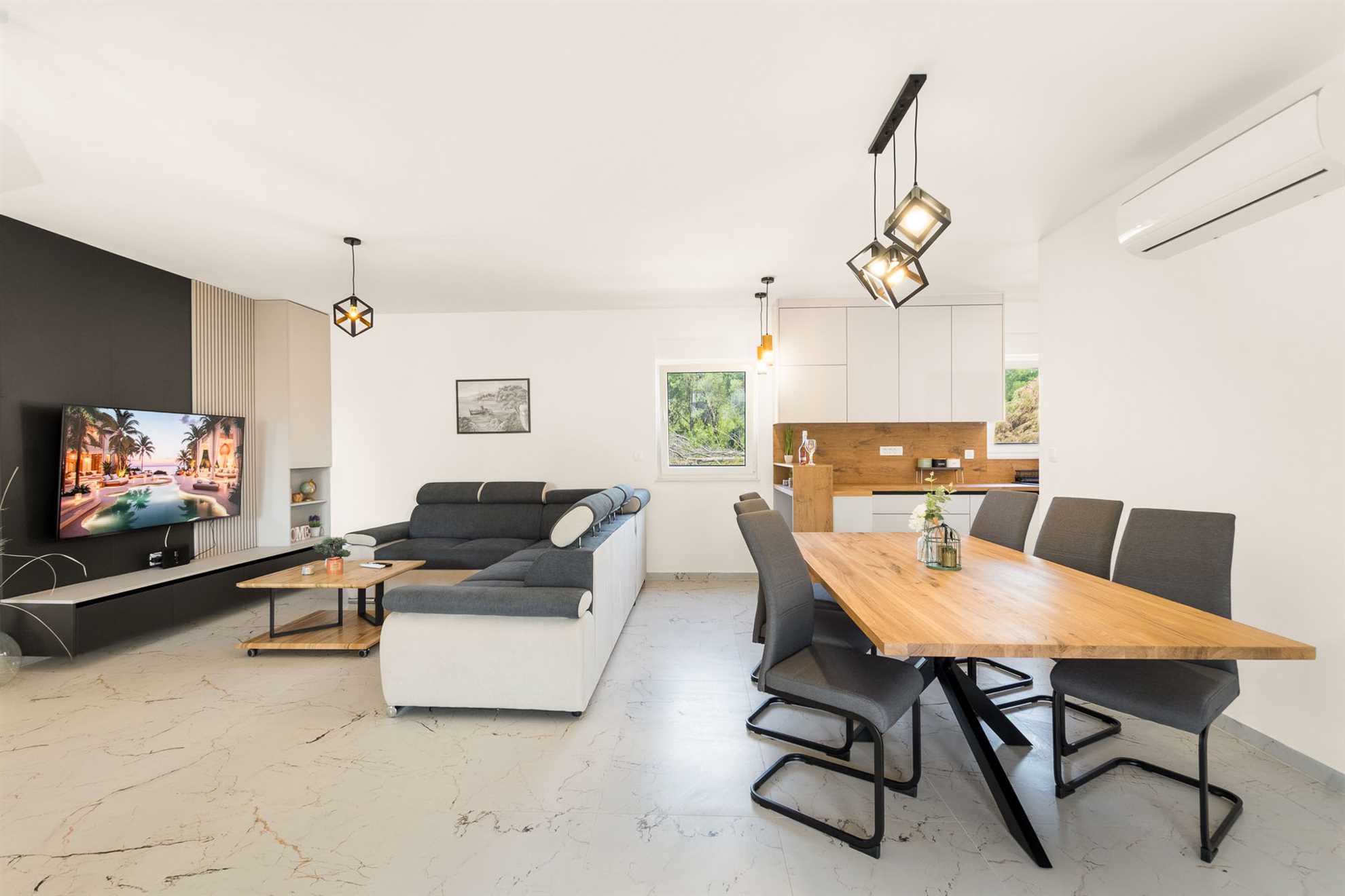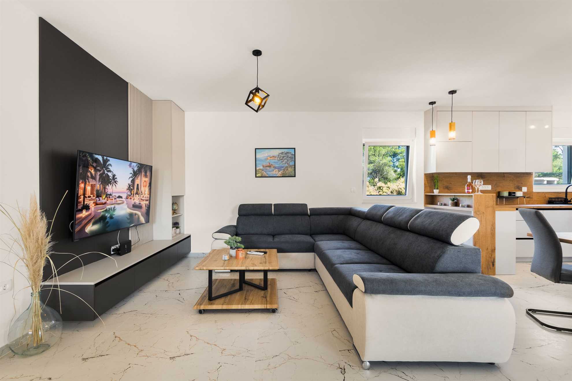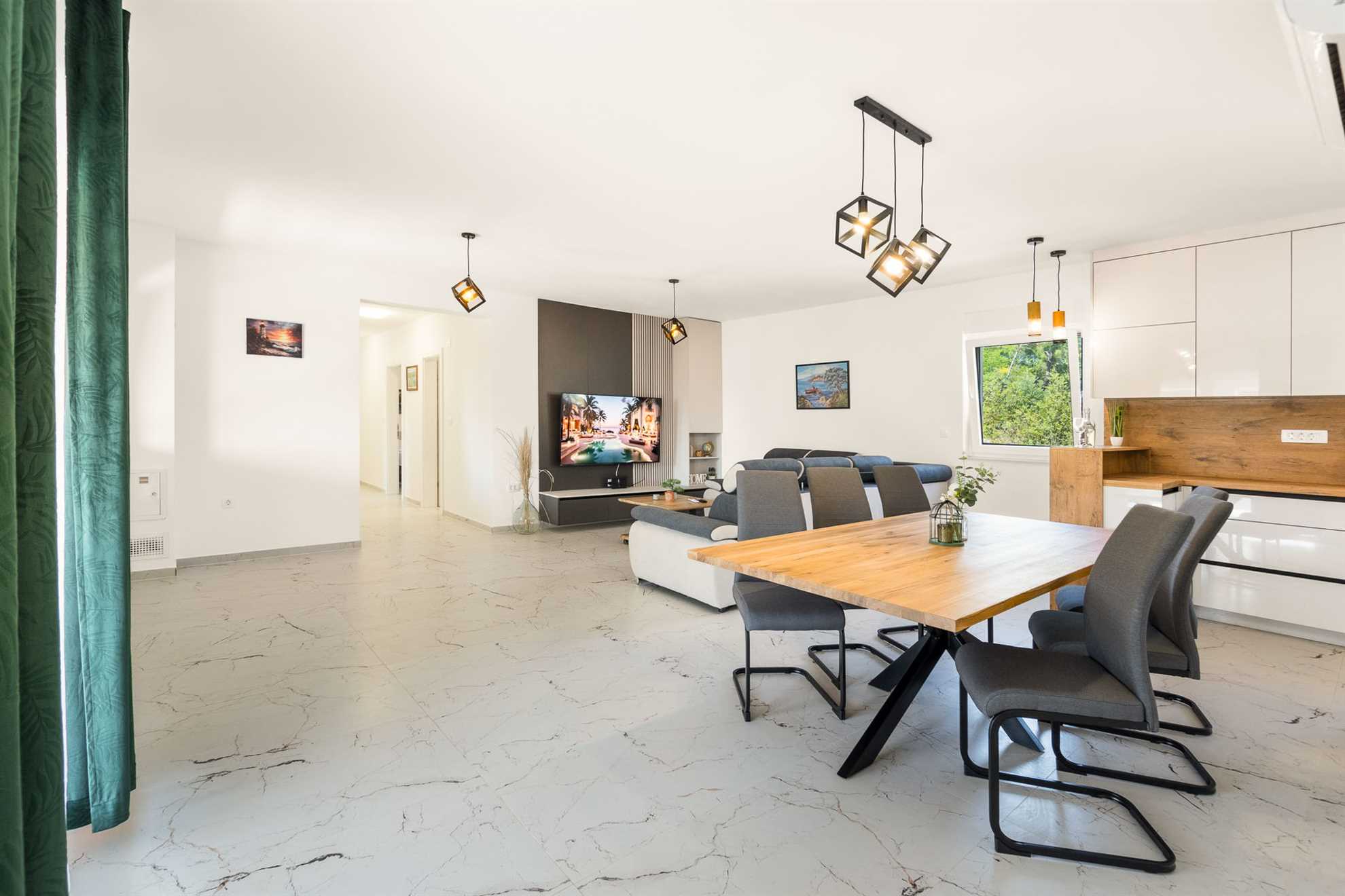 Welcome to Holiday Home Radovic, your perfect getaway on the beautiful island of Vir in Northern Dalmatia, Croatia. Just 1 km from the nearest beach, this family-friendly villa offers everything you need for a relaxing vacation under the Croatian sun. Enjoy lazy days by your private 36 m² outdoor pool with sun loungers, umbrellas, and an outdoor shower – the ideal place to unwind. The house features three comfortable bedrooms – two with queen-size beds (160×200 cm) and one with a king-size bed (180×200 cm) – as well as a modern bathroom with a walk-in shower and an additional separate toilet. The open-plan living area includes a spacious sofa, dining space, and a fully equipped kitchen for home-cooked meals. A smart TV, satellite TV, and free Wi-Fi are also available. Step outside to the large covered terrace, furnished with cozy garden furniture – perfect for dining al fresco or relaxing in the shade. The entire property is walled and enclosed, offering privacy and peace of mind for families with children. A barbecue, private garage, and additional free parking on the property are also included. Holiday Home Radovic is located in a quiet neighborhood with a low-traffic local road in front of the house. A restaurant is just 400 m away, and the town center of Vir is 3 km away. The home is ideal for up to 6 guests and includes a baby cot and high chair. Pets are welcome upon request. Discover the charm of island life and enjoy unforgettable moments at your private holiday home with pool on Vir!